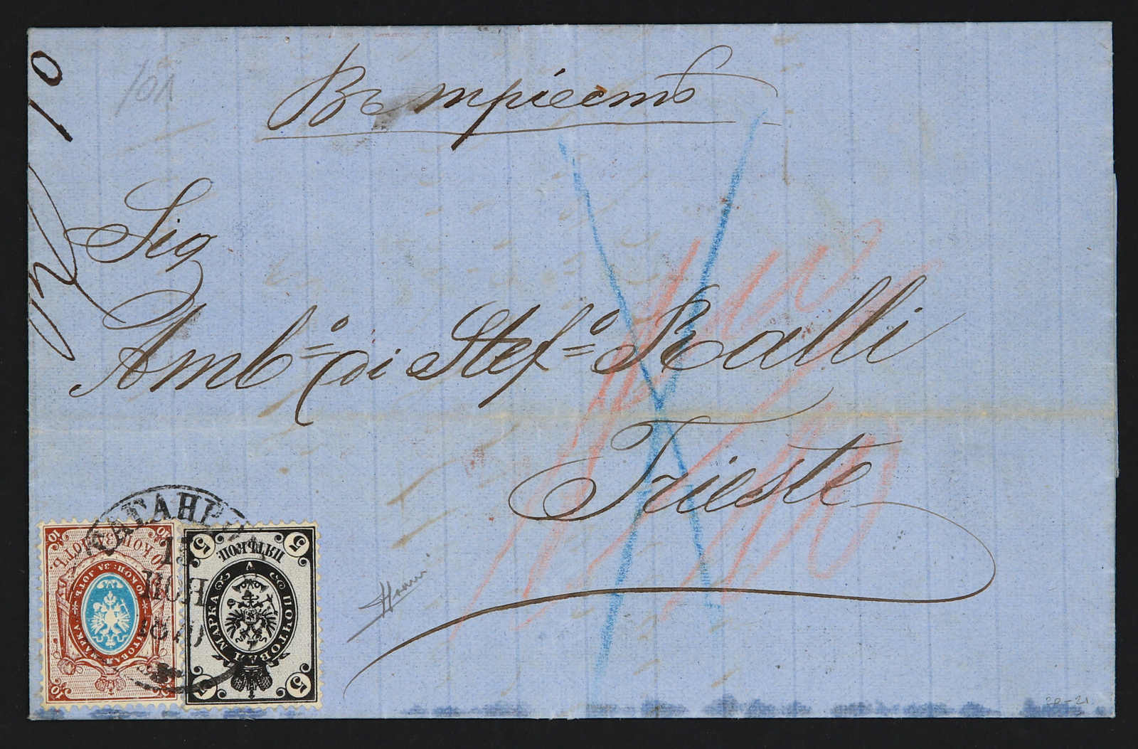 1870, entire letter from Taganrog to Triest / Italy bearing 5 kop. black/lilac and 10 kop blue/brown tied by circular "Taganrog" cds, on reverse transit and arrival cds (Image) (imagea)