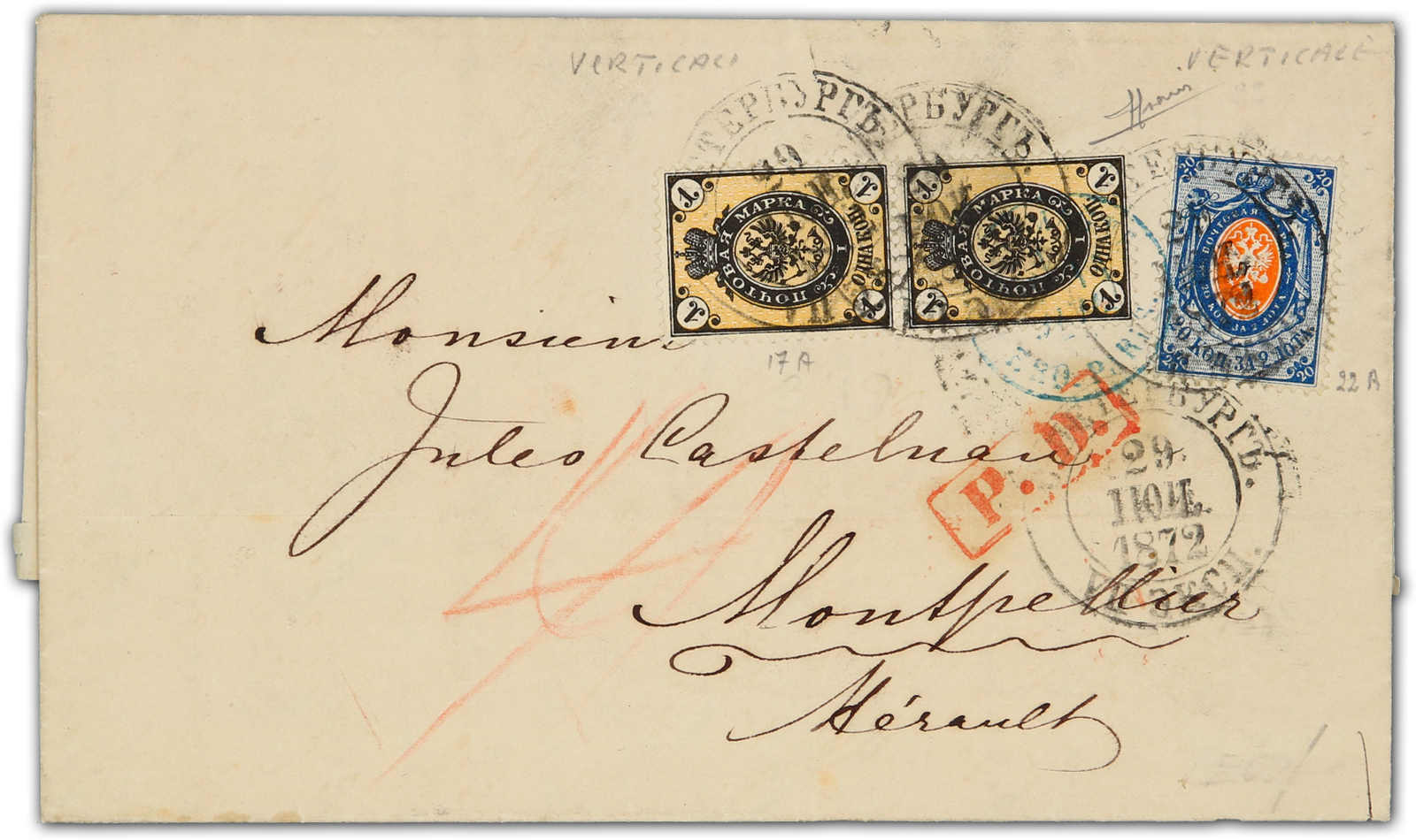 1872, entire letter from St. Petersburg to Montpellier/France bearing pair 1 kop. black/yellow and 20 kop. blue/orange tied by "St. Petersburg" cds, on reverse transit and arrival cds (Image) (imagea)