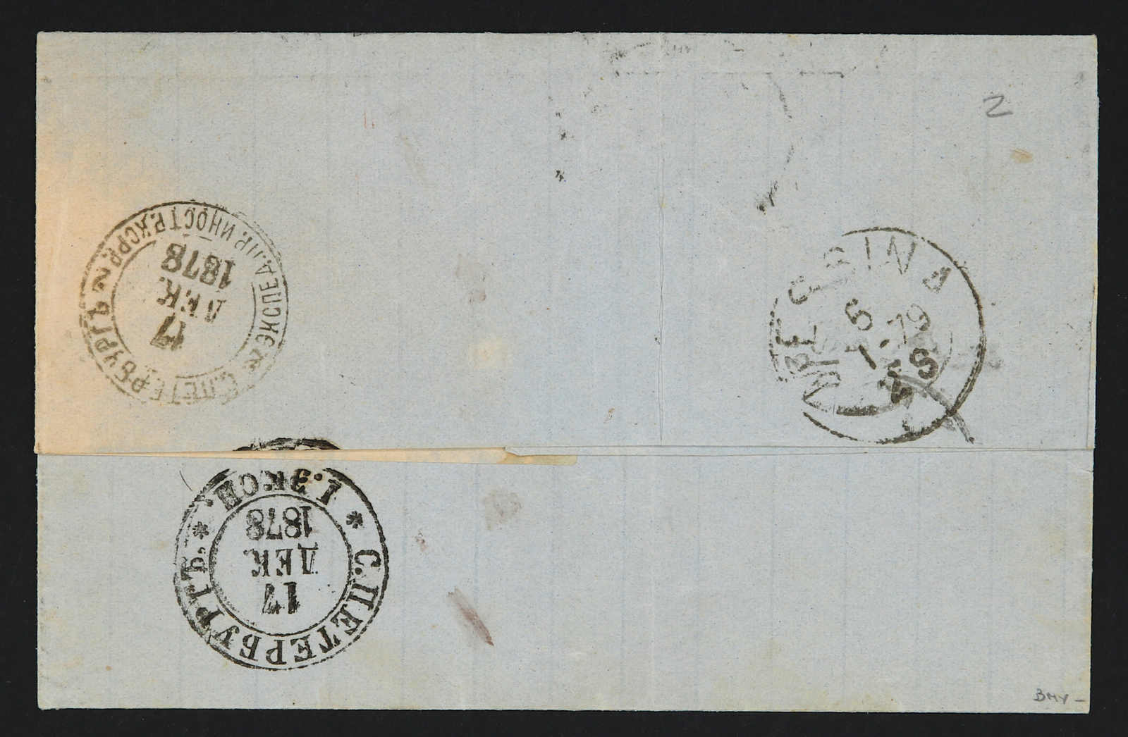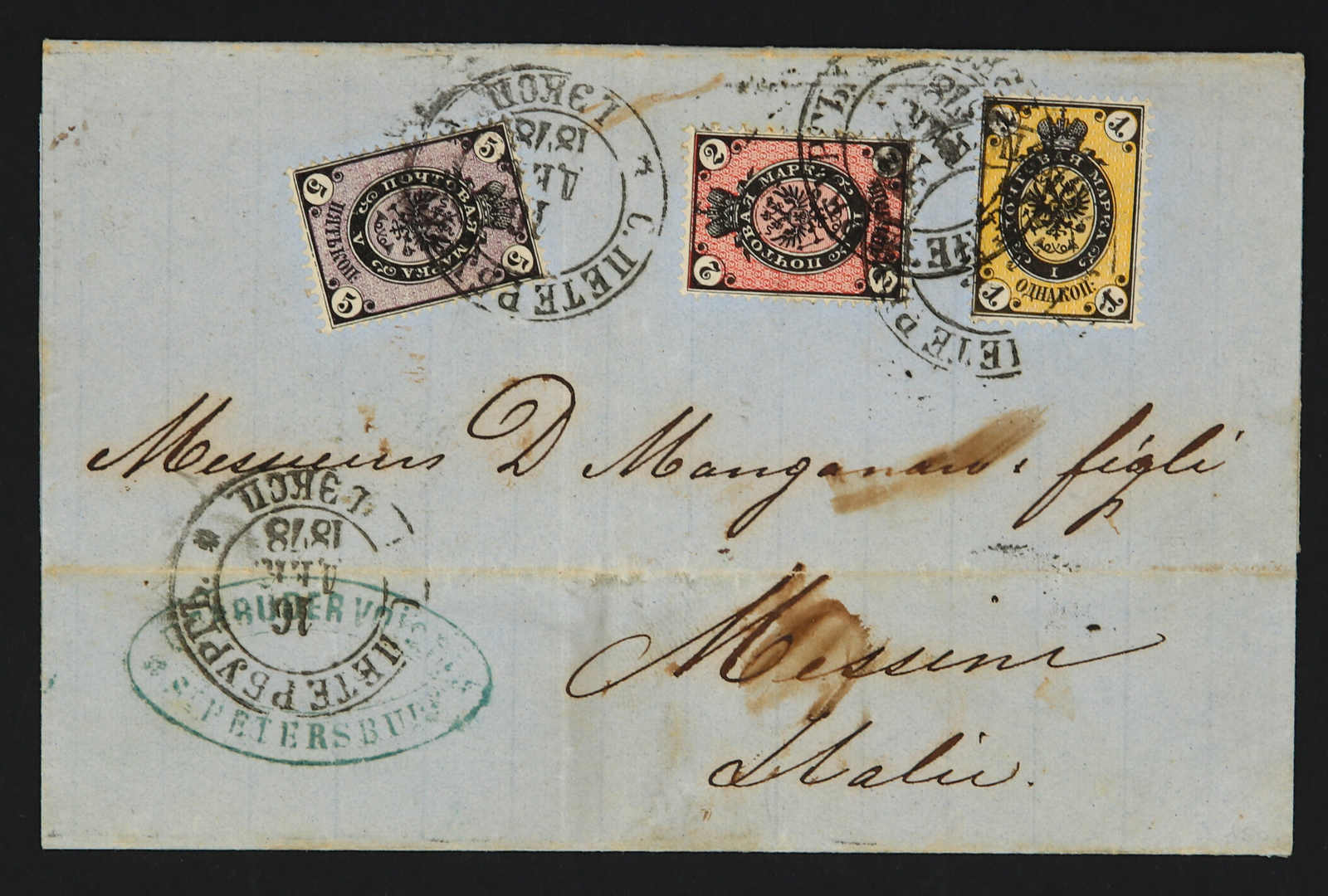 1878, entire letter from St. Petersburg to Messini / Italy bearing three color franking 1 kop. black/yellow, 2 kop. black/rose and 5 kop, black/lilac tied by circular "St. Petersburg" cds, on reverse transit and arrival cds (Image) (imagea)
