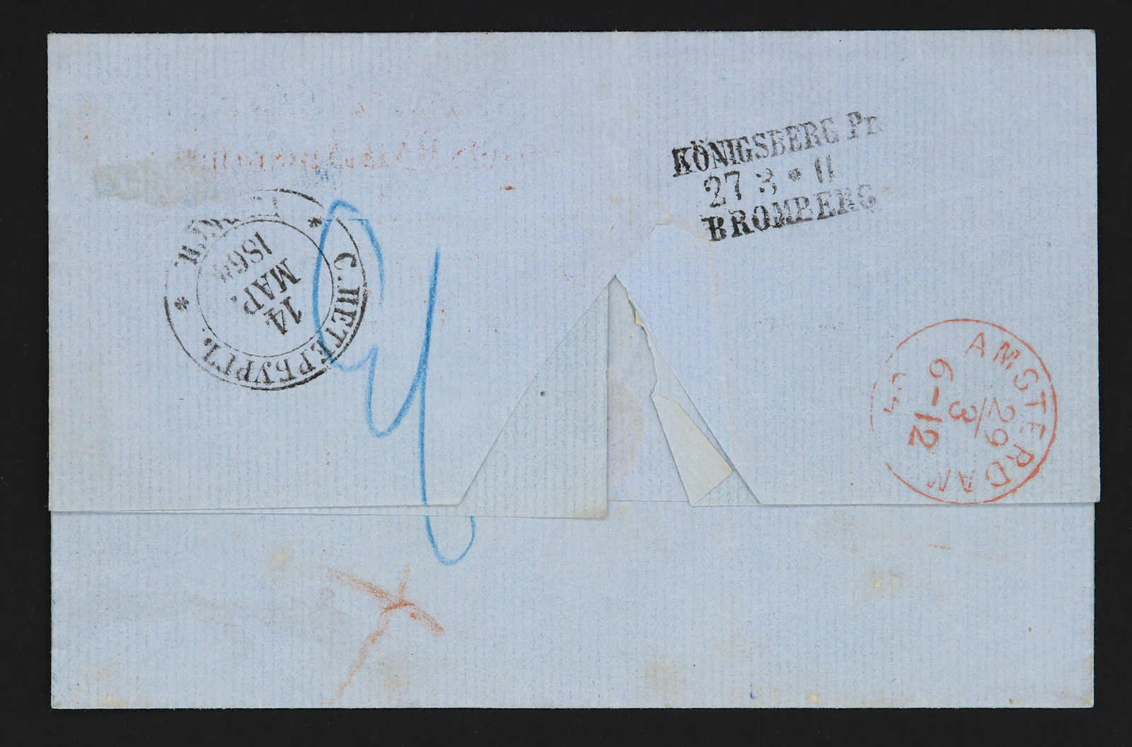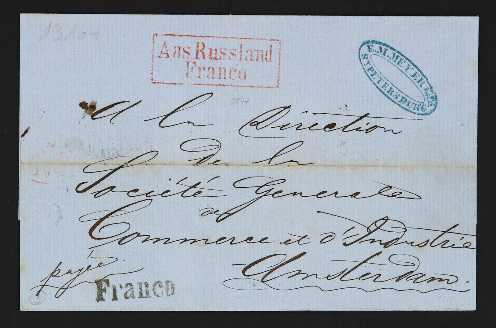 1864, Faltbriefhülle ab St. Petersburg 14.3.1864 über Bahnpost "KÖNIGSBERG Pr.-BROMBERG" nach Amsterdam, Ankunft 29.3., roter Ra2 "Aus Russland Franco" und schwarzer L1 "Franco", gute Qualität (Image) (imagea)