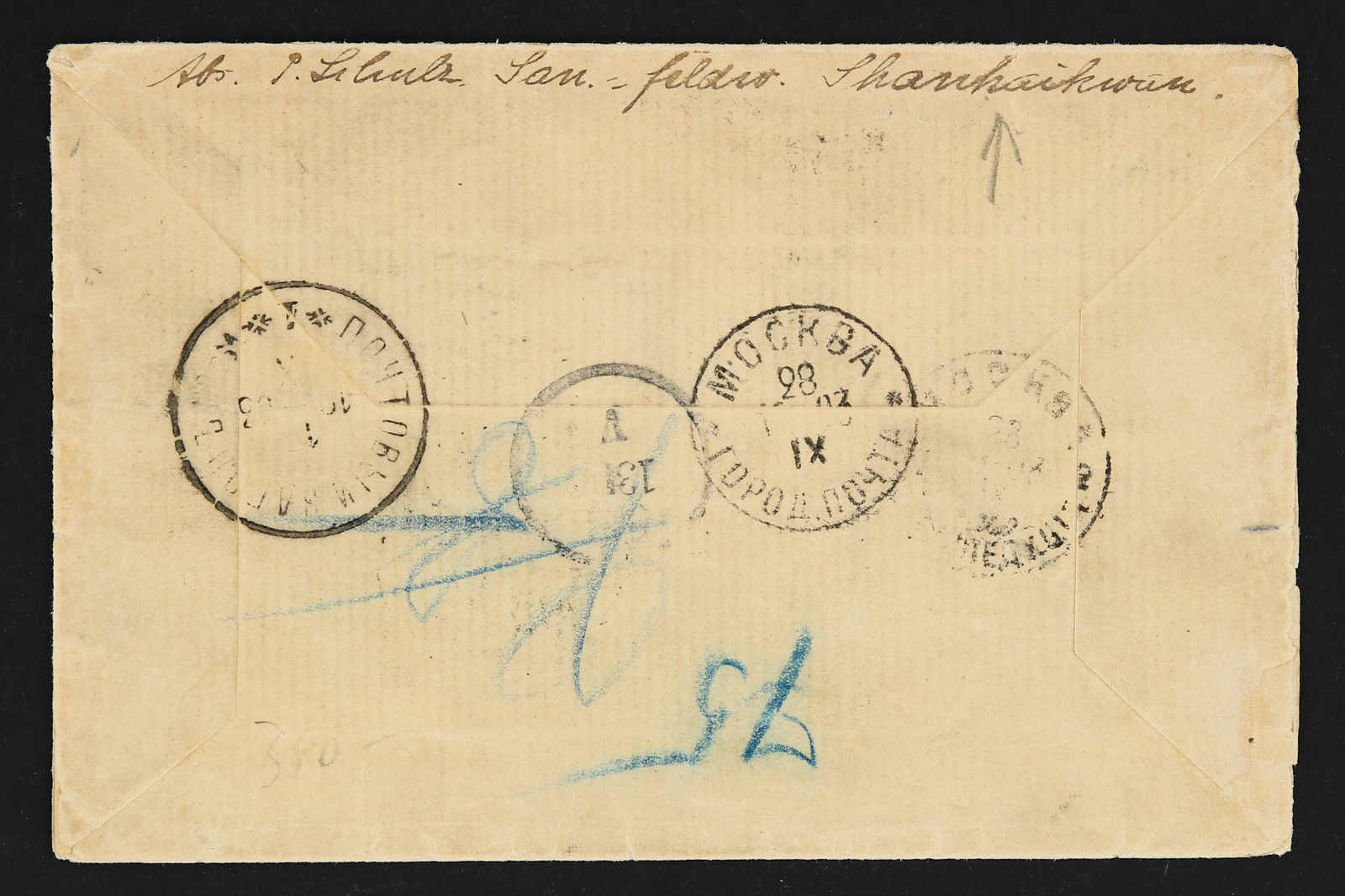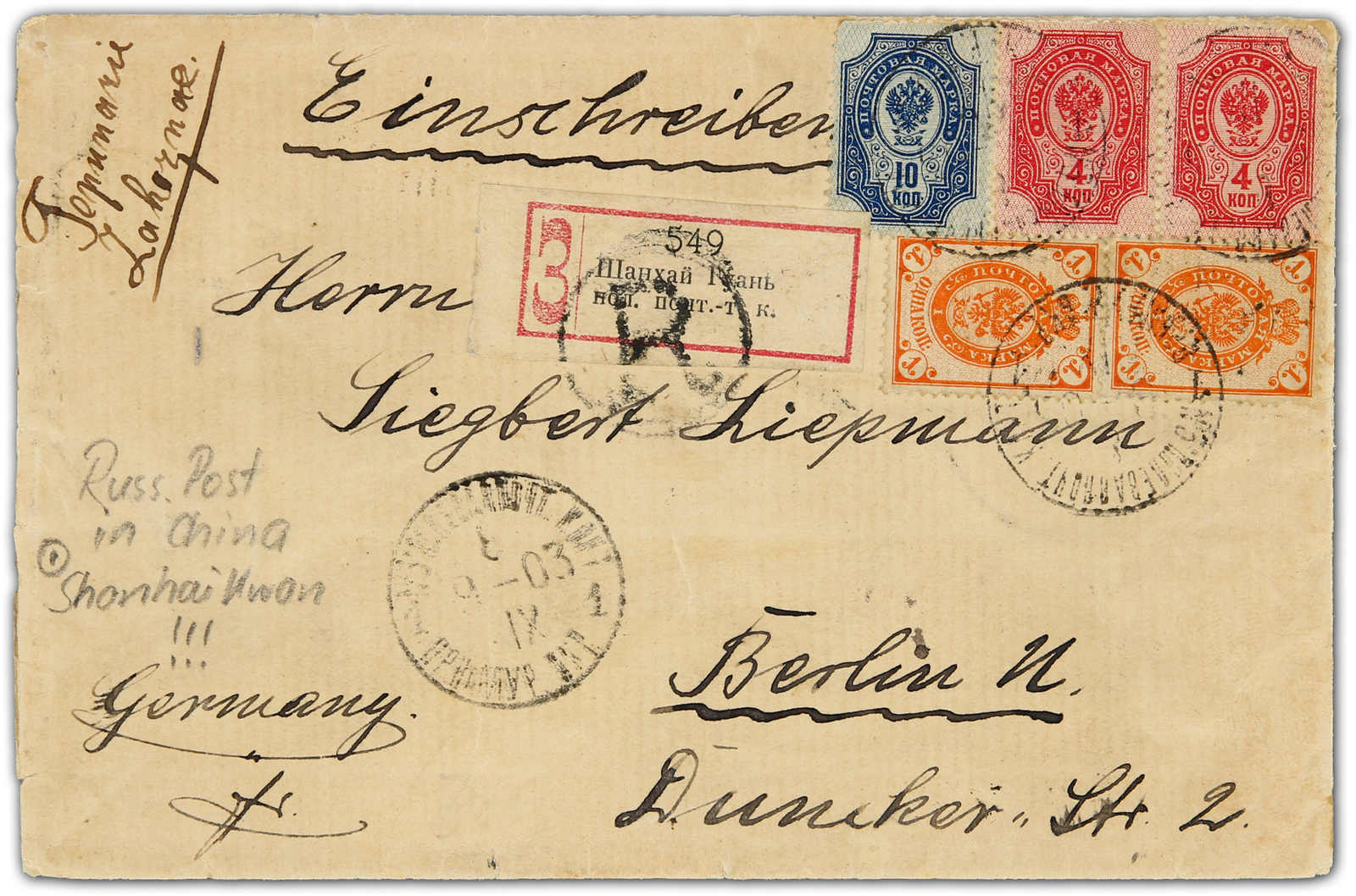 1903, Einschreibbrief, aufgegegeben bei der russ. Post und frankiert mit russ. Marken (teils Zähnungsmängel) ohne Aufdruck: 1 Kop. orange im senkr. Paar, 4 Kop. lebhaftrosarot im waager. Paar und 10 Kop. blau, aufgegeben in "SHANHAIKWAN