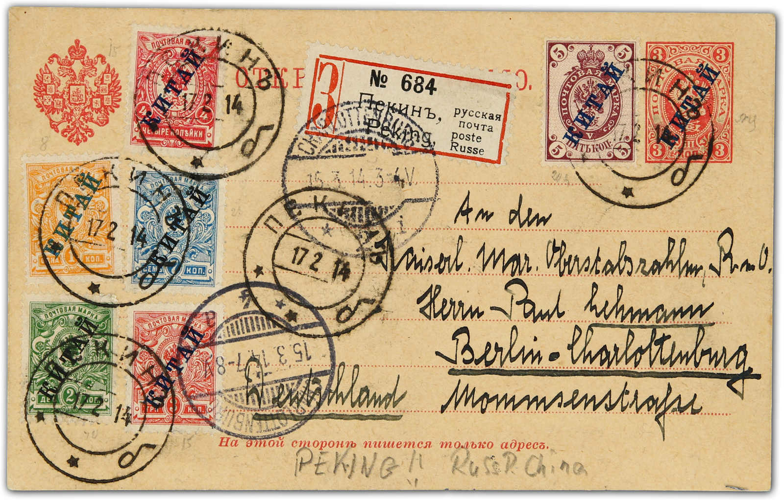 1914, 3 Kop. Ganzsachenkarte mit schrägem Aufdruck China in blau und umfangreiche Zusatzfrankatur 1 bis 7 Kop. je mit dem Aufdruck in blau als Einschreibkarte, aufgegeben in "PEKING 17.2.14", adressiert nach Berlin-Charlottenburg,
