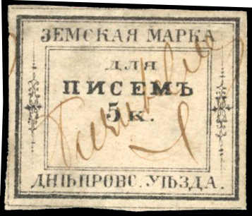 DNEPROVSK, 5 Kop. schwarz auf weißem Papier (Lithografie), geschnitten, gebr. Einzelwert, entwertet mit Federzug, farbfrisch und breitrandig, handschriftl. sign., einwandfrei (nach Soloviev 20.000,-) (Image)