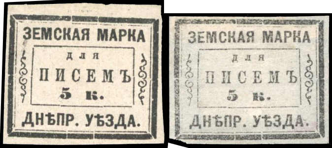 DNEPROVSK, 1871, 5 Kop. schwarz auf weißem Papier und 5 Kop. schwarz a. horizontal gestreiftem Papier, geschnitten, 2 ungebr. Einzelwerte, farbfrisch und gut geschnitten, dabei die Nr. 3 sign. Ferrari Faberge, gute Qualität (nach Soloiev