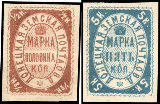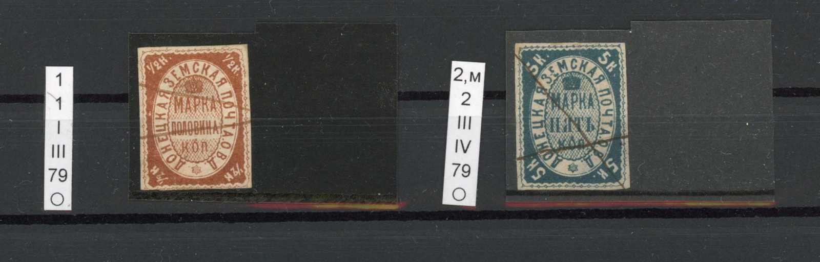 DONEZK, 1879, ½ Kop. braun und 5 Kop. blau, je als Einzelwerte ungebr. und mit Federzug entwertet, alle farbfrisch und gut gerandet, gute Qualität (nach Soloviev ca. 700,-) (Image) (imagea)