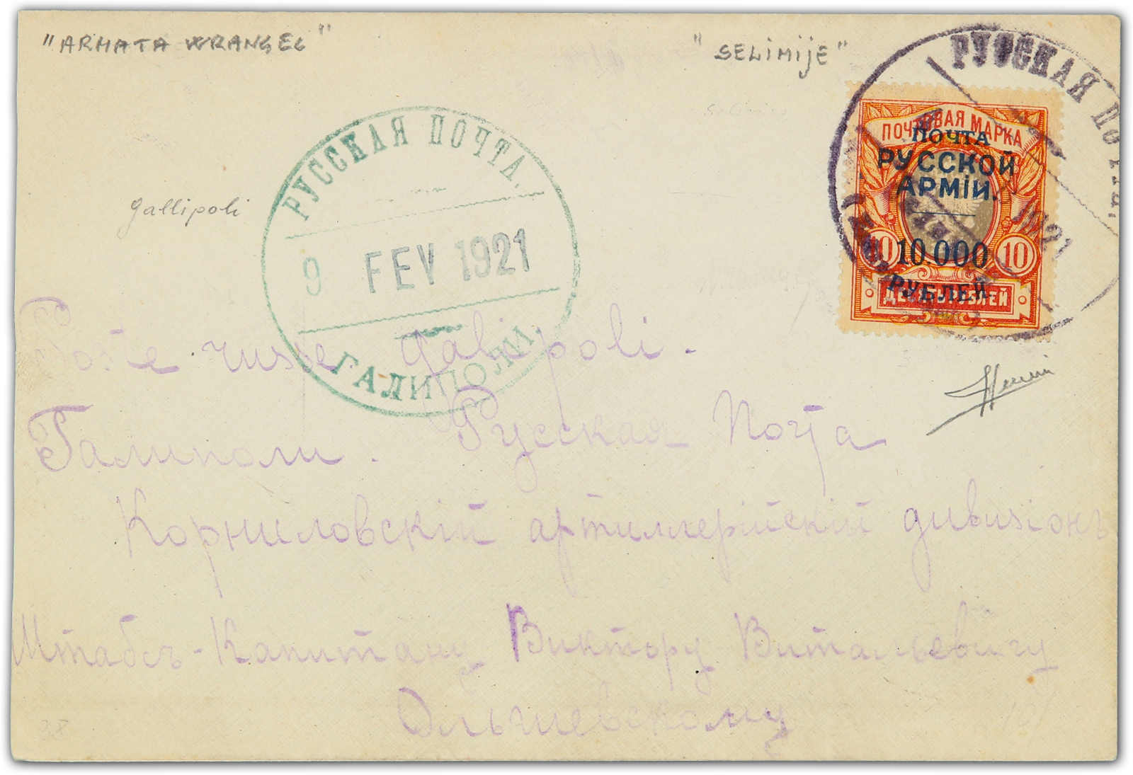 1921, Wrangel army cover bearing 10000 rb. Tied by "Selimiye" postmark sent to Gallipoli alongside showing all Cyrillic Gallipoli cds, signed Sorani