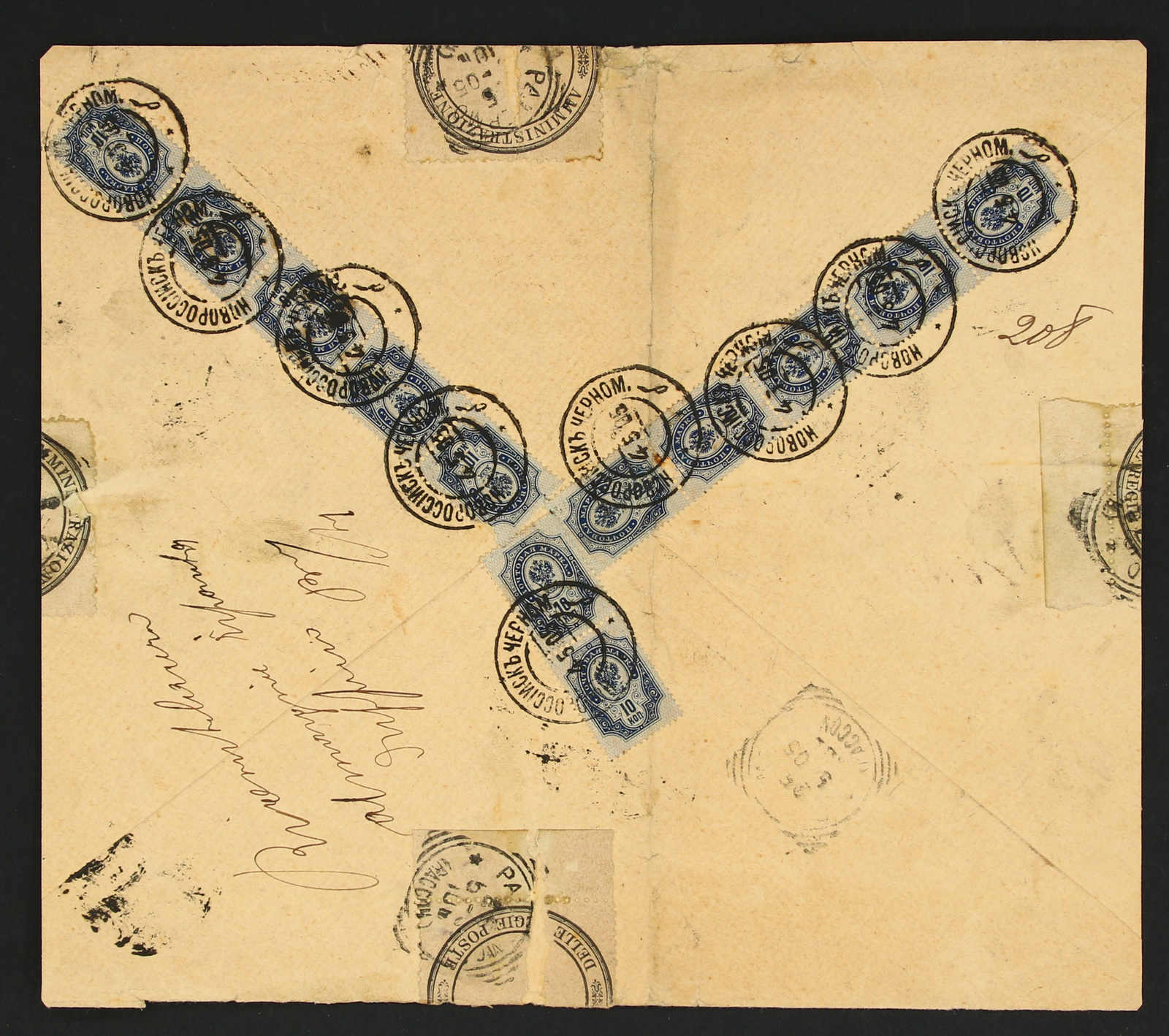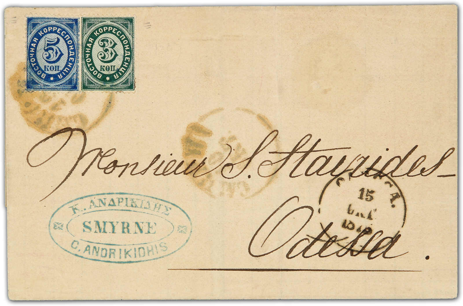 1875, an entire letter was sent from the Smyrne office to Odessa bearing 1872 issue 3 kop. green and 5 kop. blue, tied by all Cyrillic "SMYRNE" cds, alongside "Odessa" arrival cds (Image)
