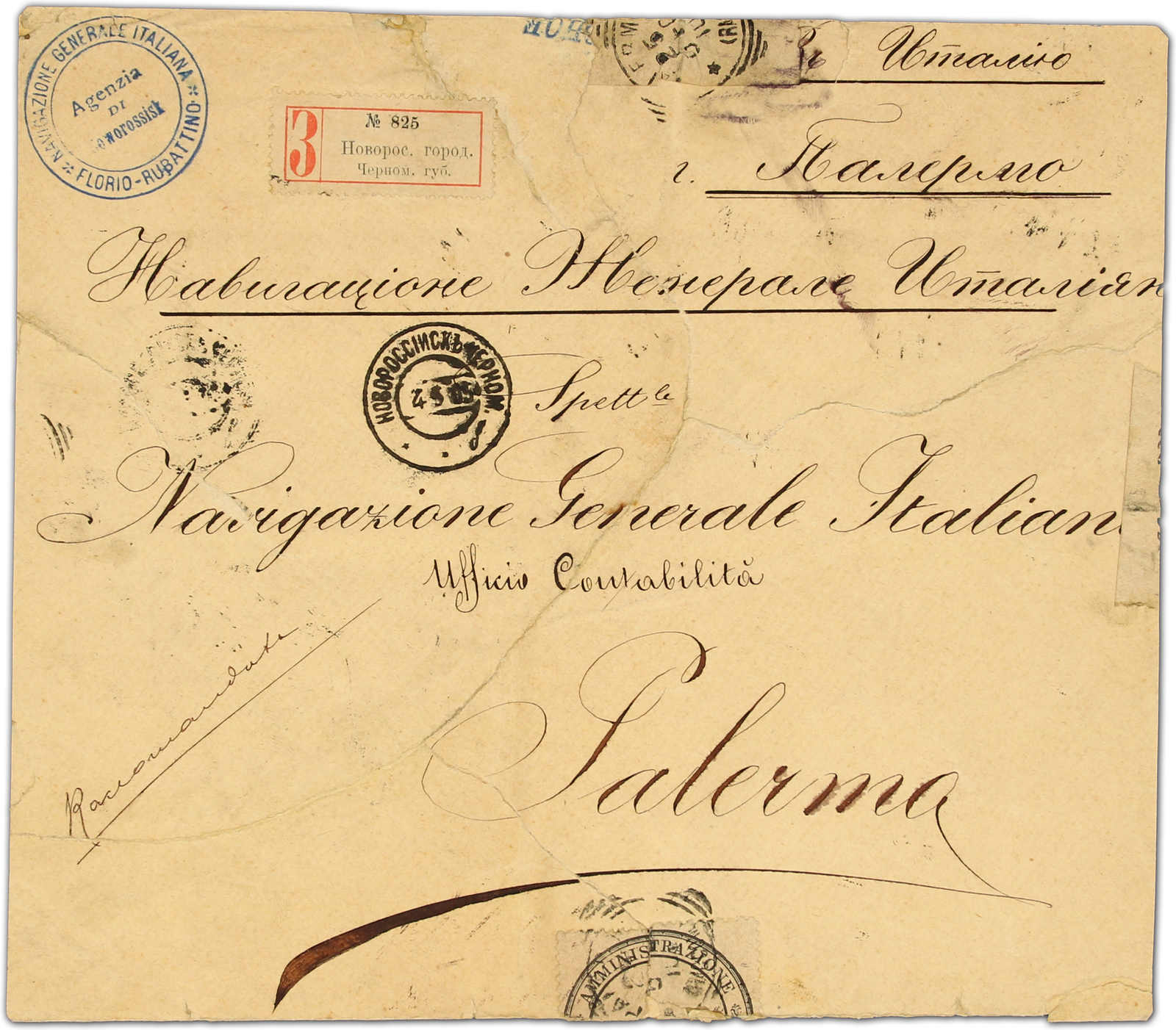 1905, large registered cover bearing on reverse 12x 10 kop. all tied by "Novoros-Gorod" postmarks sent to Palermo/Italy, on front maritime company cachet of "NAVIGAZIONE GENERALE ITALIANA FLORIO-RUBATTINO AGENZIA DI Noworossisk" cachet (Image) (imagea)