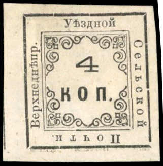 187?, Verkhnedneprovsk 4 K. Ziffer schwarz, ungebr. Einzelwert aus der linken unteren Bogenecke, auf waager. gestreiftem Papier, farbfrisch und breitrandig, gute Qualität (Image)