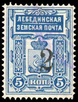 1899, LEBEDIN, "2" (K.) auf 5 K. Wappen in blau, schwarzer Aufdruck des neuen Wertes als gest. Einzelwert, farbfrisch und gut gezähnt, nach Soloviev-Katalog 4.000,-, selten angeboten (Image)