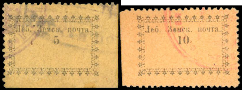 1918, LEBEDIN, 5 K. schwarz a. graugelblichem Papier und 10 K. schwarz a. orangefarbenem Papier, je als gest. Einzelwert, farbfrisch und gut gezähnt, dabei der Wert zu 5 K. aus der unteren rechten Bogenecke und an den Rändern nicht