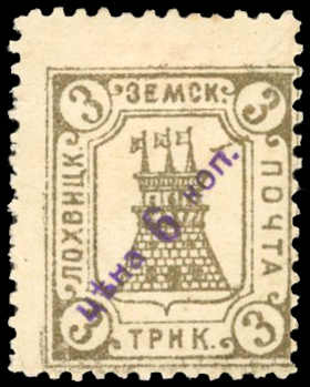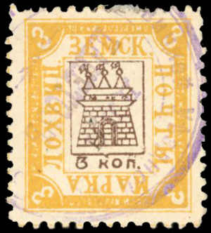 1899, LOKHVITSA 3 K. Wappen gelb/braun, gest. Einzelwert, farbfrisch und wie üblich etwas unruhig gezähnt, sonst einwandfrei, nach Soloviev-Katalog 1.500,-