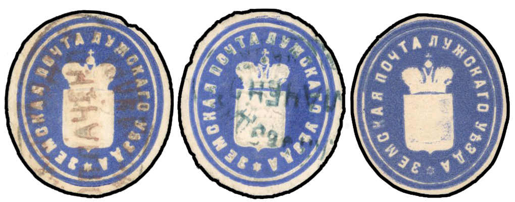 1874/76, Luga, 5 K. Wappen ultramarin, 3 geschnittene Werte, in den 3 bekannten Typen, dabei 2 Werte gest. und ein Wert ungebr., alle farbfrisch und gut geschnitten, nach Soloviev-Katalog 2.250,- (Image)