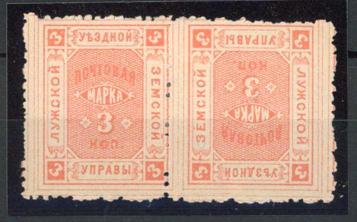 1886, Luga, 3 K. Ziffer rosarot im ungebr. Kehrdruckpaar, farbfrisch und üblich etwas unsauber gezähnt, sonst einwandfrei, nach Soloviev-Katalog 400,-