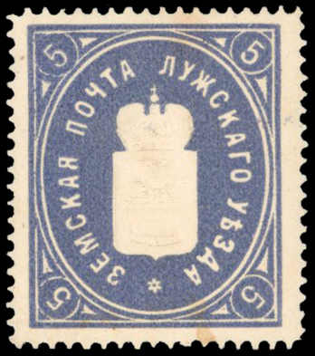 1877, Luga, 5 K. Wappen milchblau gestanzt, ungebraucht, farbfrisch mit deutlicher Prägung, nach Soloviev-Katalog 20.000,-, ein extrem seltener Wert