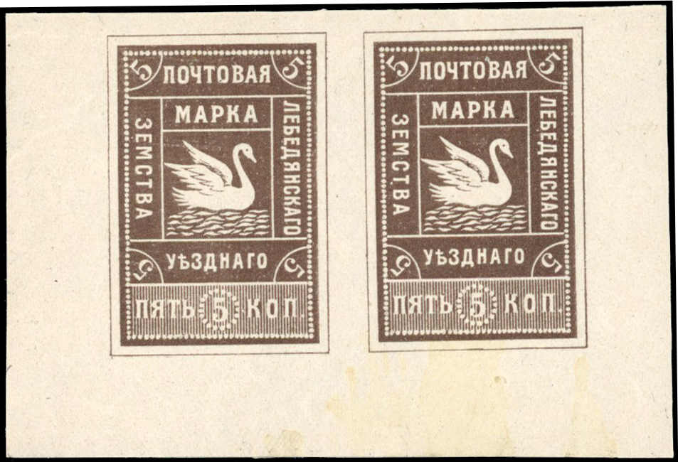 LEBEDIAN, 1901, 5 Kop. Schwan braun als Probedruck im ungebr. waager. Unterrandpaar, farbfrisch und breitrandig, einwandfrei, selten angeboten