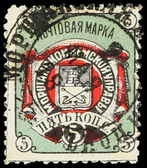 MORSHANSK, 1885, 5 Kop. Wappen schwarz/ hellgrün/ rot, farbfrisch und üblich gezähnt, entwertet mit sauberem DKr., gute Qualität, selten angeboten (nach Soloviev 4.000,-) (Image)