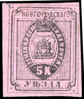 NOVGOROD, 1878, 5 Kop. Wappen schwarz a. rosalila Papier, ungebr. Einzelwert, farbfrisch und gut geschnitten, saubere Qualität (nach Soloviev 1.000,-)