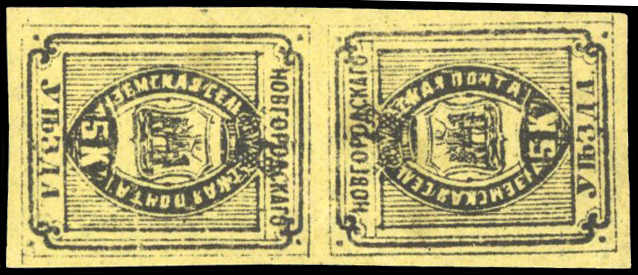 NOVGOROD, 1882, 5 Kop. Wappen schwarz a. gelblichem Papier, ungebr. senkr. Kehrdruckpaar, dabei ein Wert postfr., farbfrisch und vollrandig geschnitten, einwandfrei (nach Soloviev 750,-++) (Image)