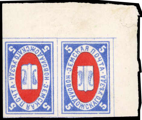NOVYA LADOGA, 1879, 5 Kop. Wappen blau/rot, ungebr. Kehrdruckpaar aus der rechten oberen Bogenecke, farbfrisch und vollrandig geschnitten, der rechte Wert und der Oberrand dünne Stelle, sonst gute Qualität (nach Soloviev 2.500,-) (Image)