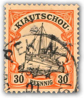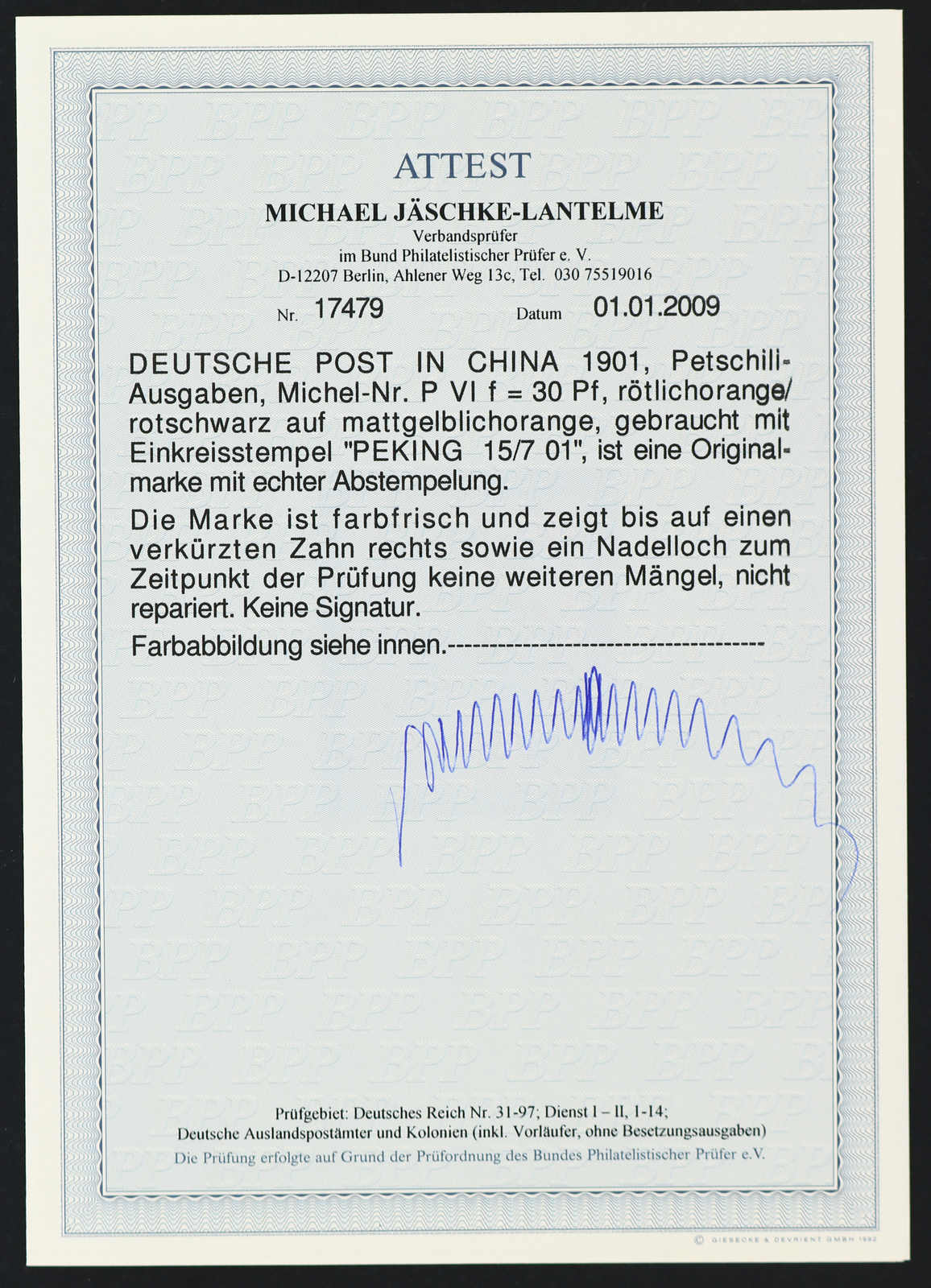 1901, 30 Pfg. Kaiseryacht von Kiautschou rötlichorange/rotschwarz auf mattgelblichorange als Petschiliausgabe, gestempelt "PEKING 15/7 01", farbfrisch, verkürzter Zahn rechts und Nadelloch, Fotoattest Jäschke-Lantelme BPP (ME 1.200,-) (Image) (imagea)