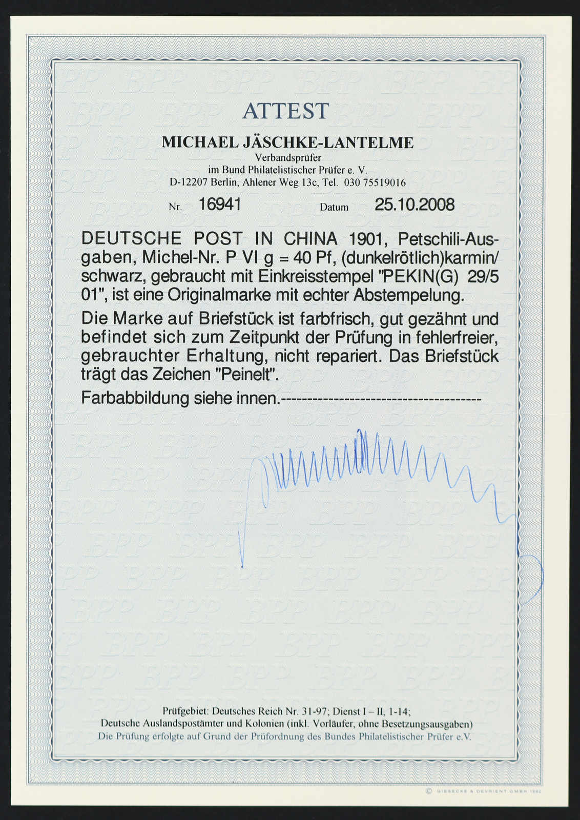 1901, 40 Pfg. Kaiseryacht von Kiautschou (dunkelrötlich)karmin/schwarz als Petschiliausgabe, gestempelt "PEKIN(G) 29/5 01", farbfrisch, einwandfrei, signiert, Fotoattest Jäschke-Lantelme BPP (ME 950,-) (Image) (imagea)
