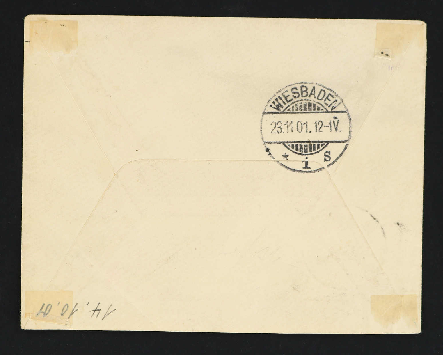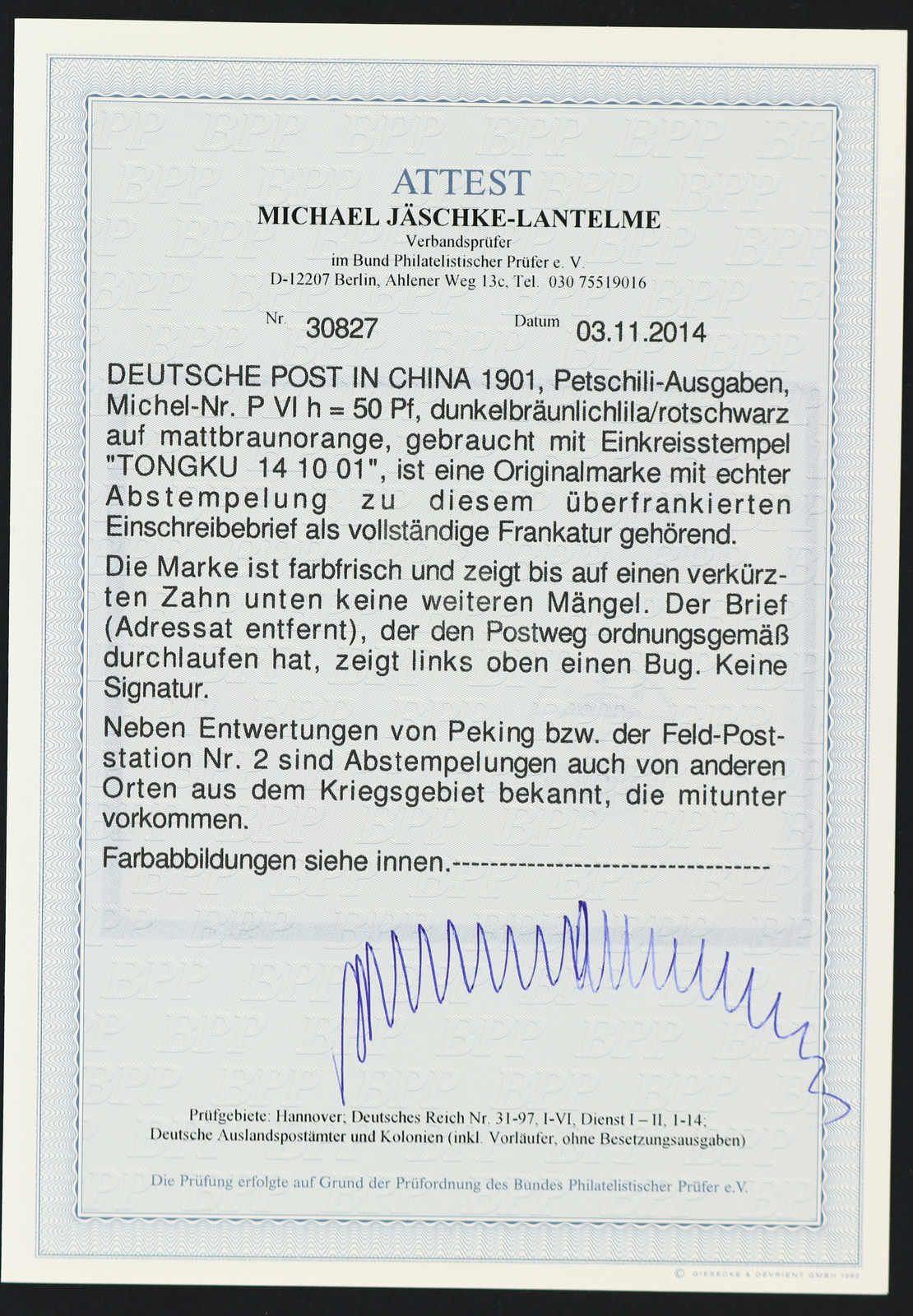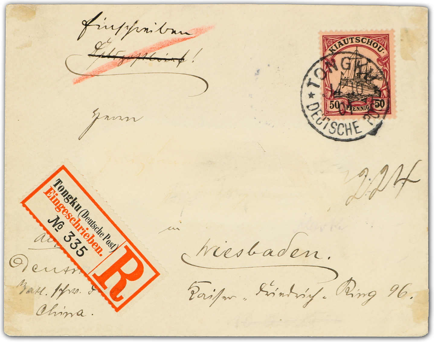 1901, 50 Pfg. Kaiseryacht von Kiautschou dunkelbräunlichlila/rotschwarz auf mattbraunorange als Petschiliausgabe, glasklar entwertet "TONGKU 14 10 01" auf überfrankiertem R-Brief, farbfrisch, verkürzter Zahn unten, Adressat entfernt,