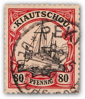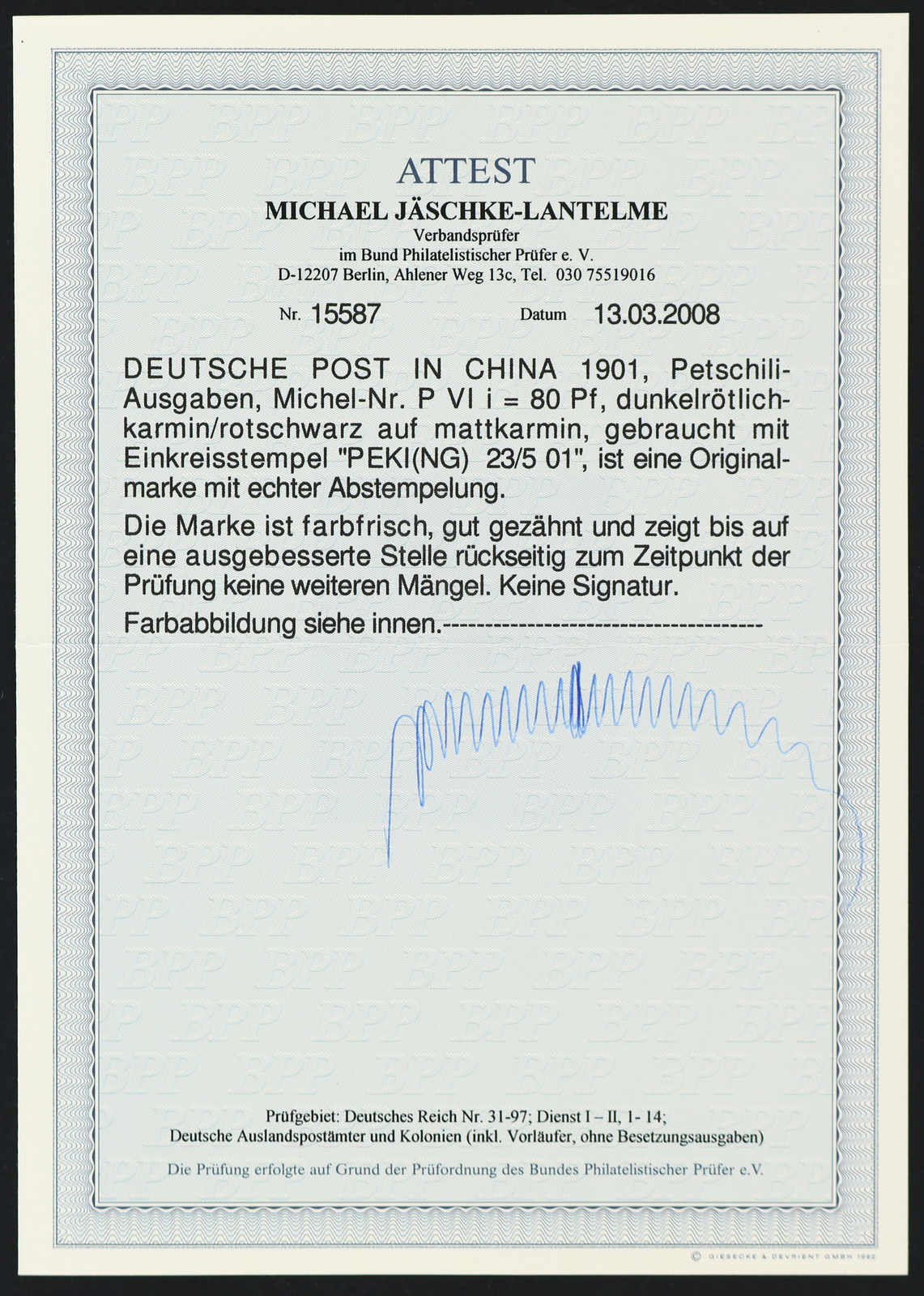 1901, 80 Pfg. Kaiseryacht von Kiautschou dunkelrötlichkarmin/rotschwarz auf mattkarmin als Petschiliausgabe, gestempelt "PEKI(NG) 23/5 01", farbfrisch, ausgebesserte Stelle, Fotoattest Jäschke-Lantelme BPP (ME 1.600,-) (Image) (imagea)