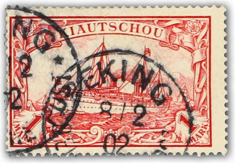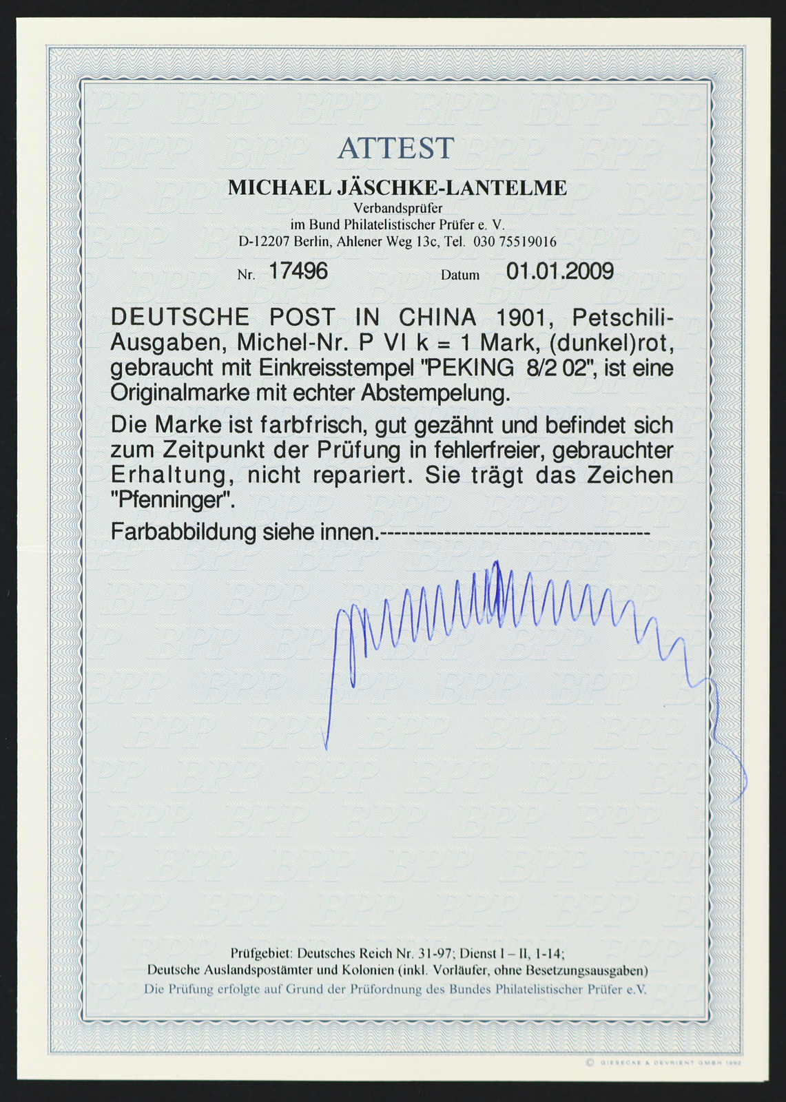 1901, 1 M. Kaiseryacht von Kiautschou (dunkel)rot als Petschiliausgabe, klar gestempelt "PEKING 8/2 02", farbfrisch, einwandfrei, signiert Pfenninger, Fotoattest Jäschke-Lantelme BPP (ME 1.700,-) (Image) (imagea)