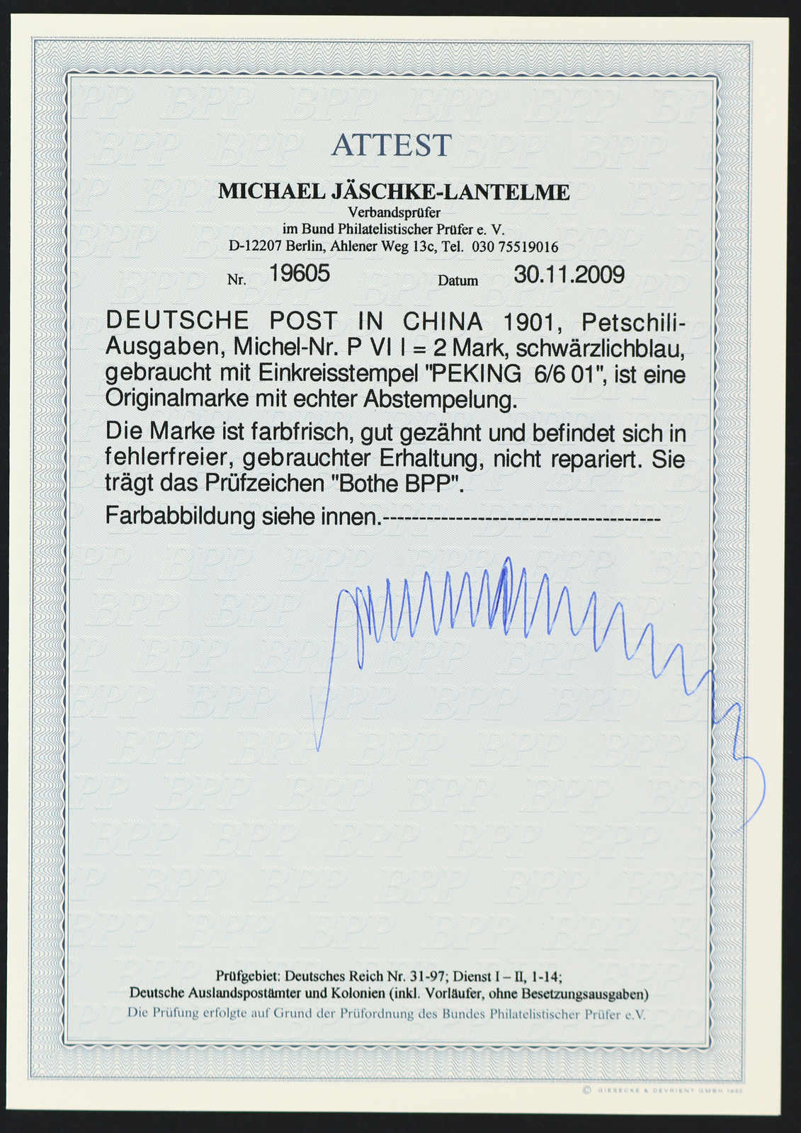 1901, 2 M. Kaiseryacht von Kiautschou schwärzlichblau als Petschiliausgabe, gestempelt "PEKING 6/6 01", farbfrisch, einwandfrei, geprüft Bothe BPP, Fotoattest Jäschke-Lantelme BPP (ME 2.200,-) (Image) (imagea)