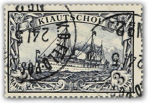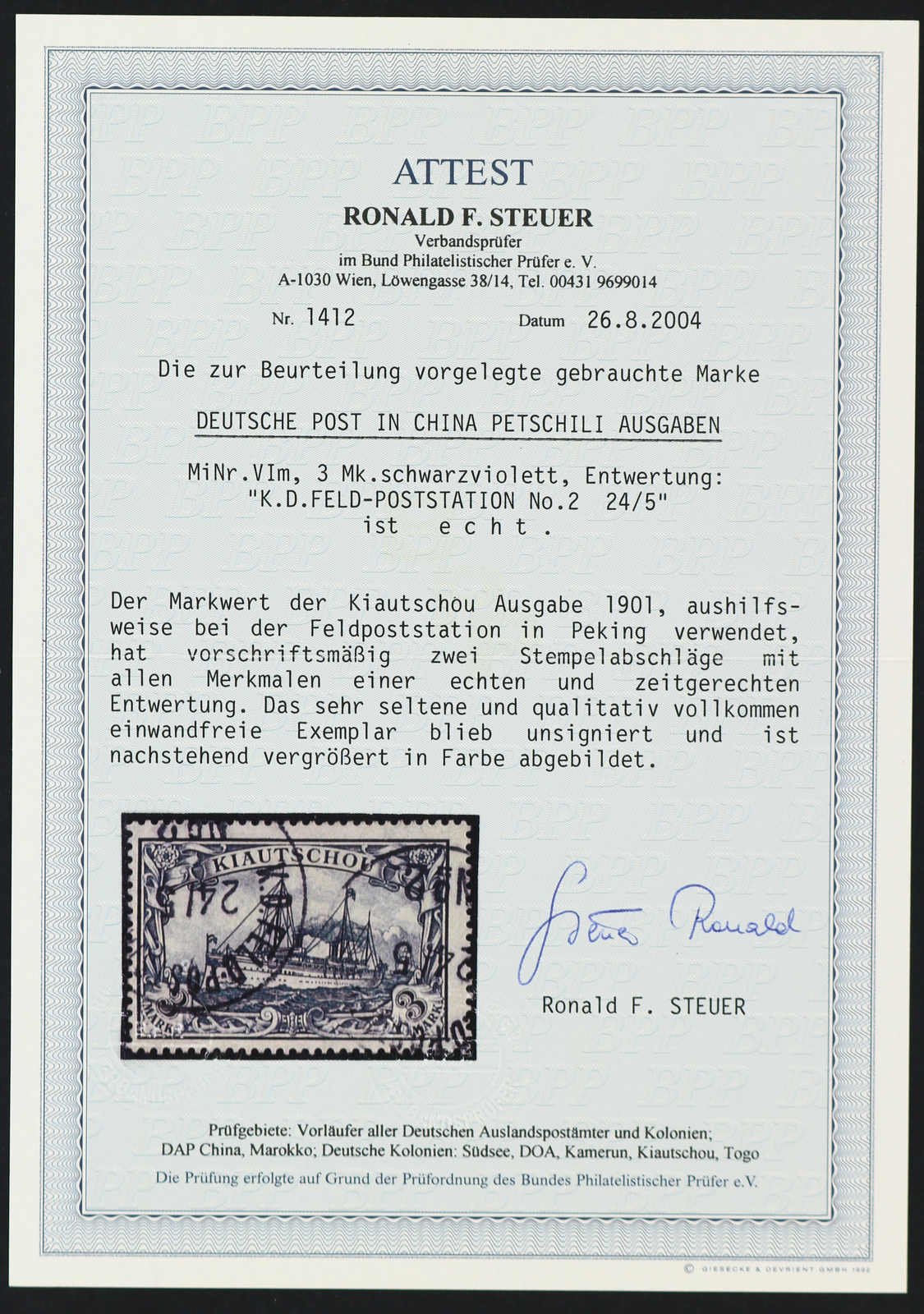 1901, 3 M. Kaiseryacht von Kiautschou schwarzviolett als Petschiliausgabe, gestempelt "K.D. FELD-POSTSTATION No. 2 24/5", farbfrisch, einwandfreies Exemplar dieser seltenen Marke, signiert, Fotoattest Steuer BPP (ME 3.800,-) (Image) (imagea)