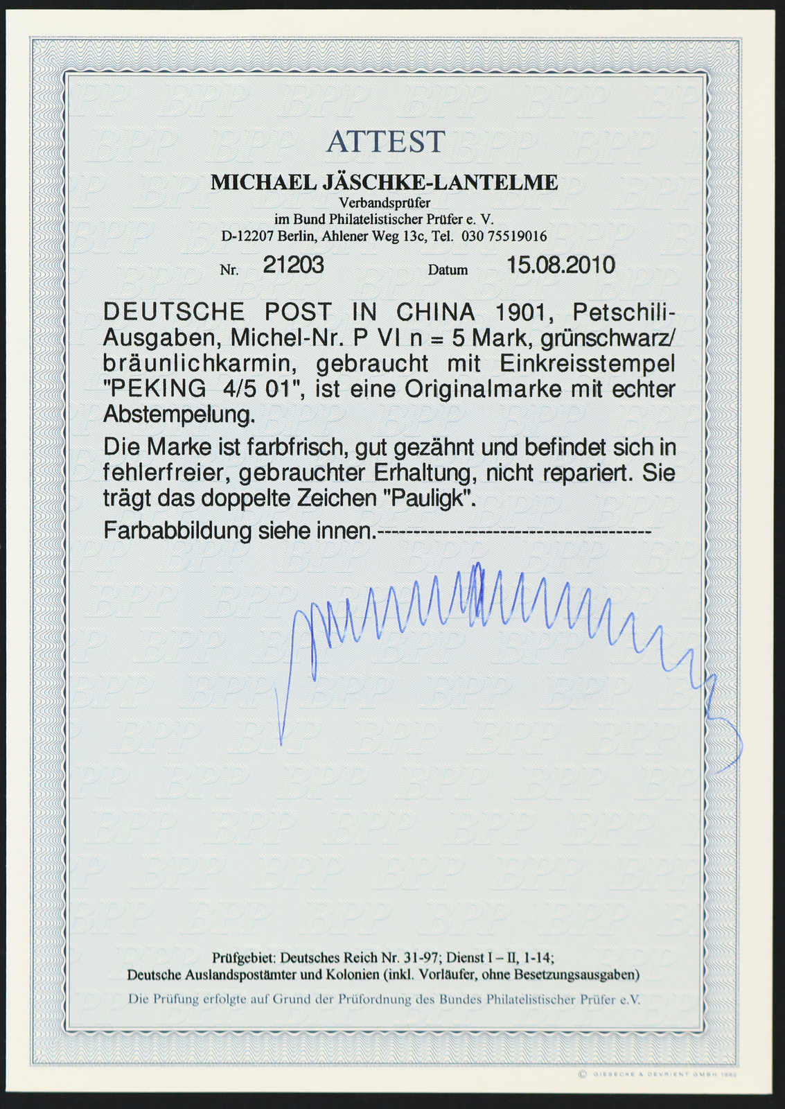 1901, 5 M. Kaiseryacht von Kiautschou grünschwarz/bräunlichkarmin als Petschiliausgabe, gestempelt "PEKING 4/5 01", der Höchstwert dieser Ausgabe präsentiert sich farbfrisch in einwandfreier Qualität, signiert Pauligk, Fotoattest