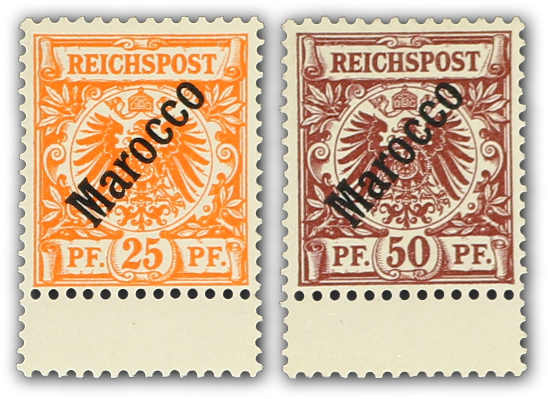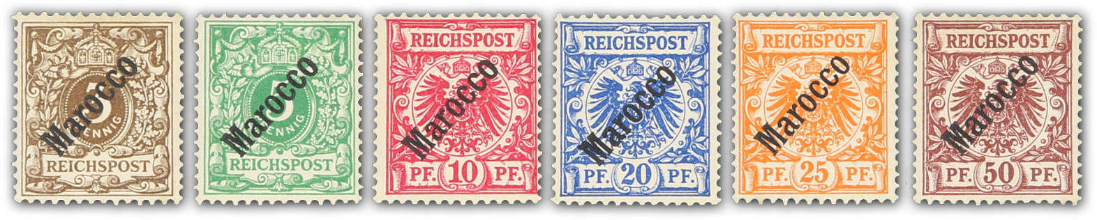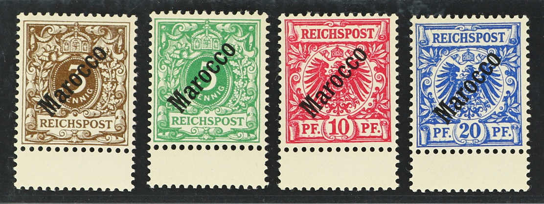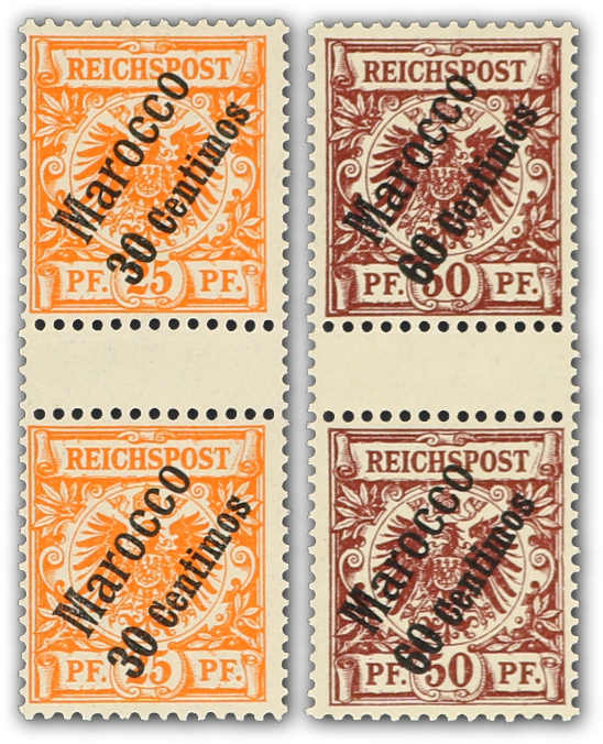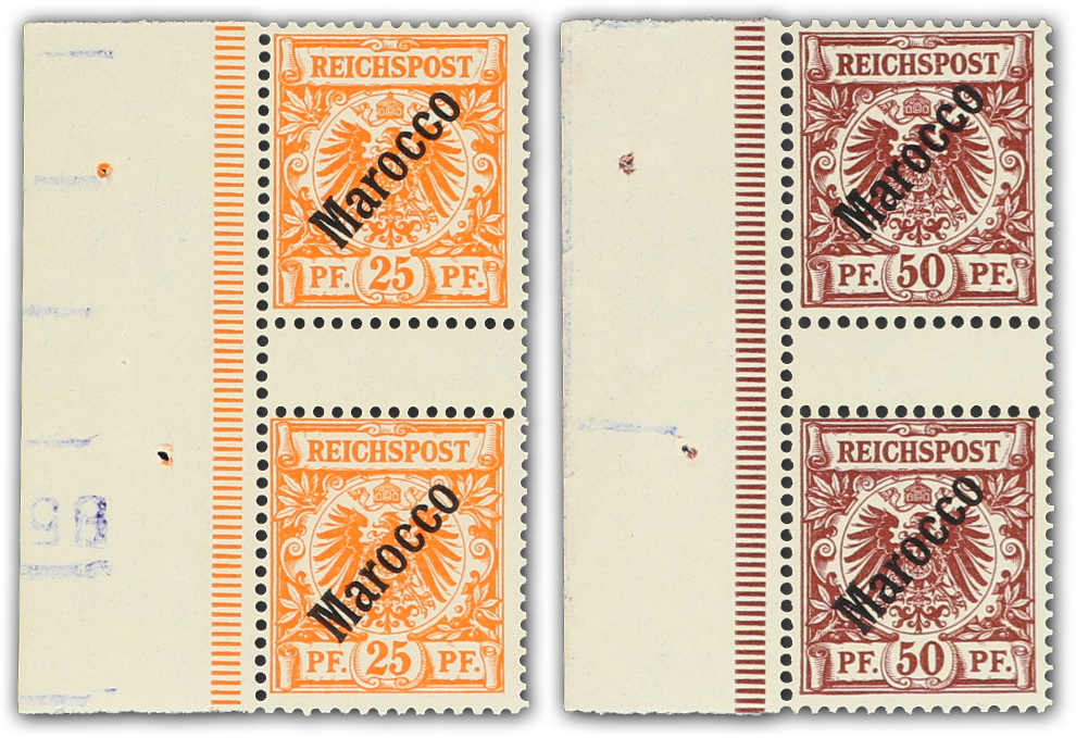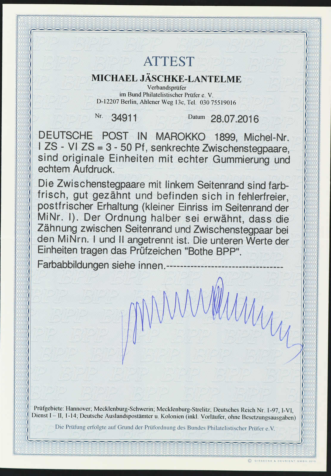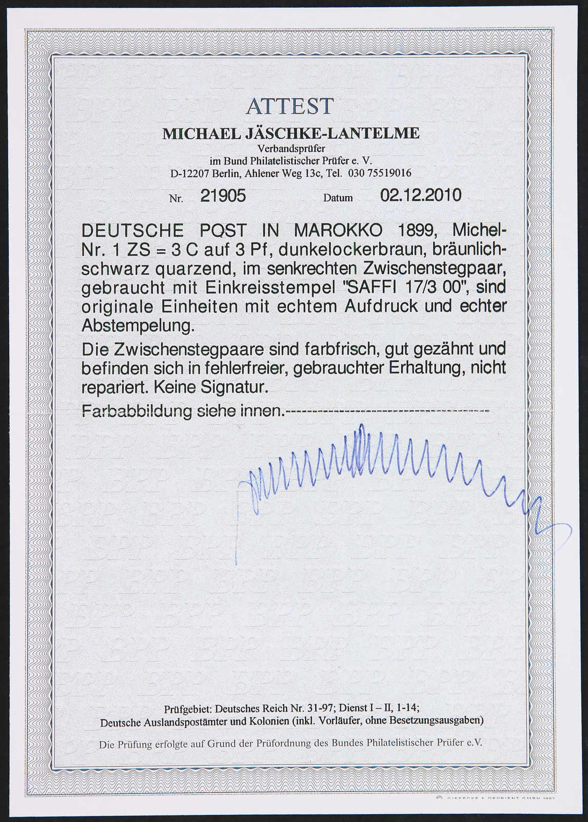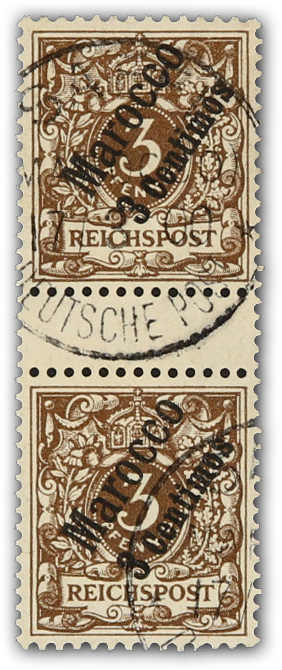 1899, 3 C. dunkelockerbraun mit schrägem Aufdruck "Marocco" und Wertangabe, senkrechtes Zwischenstegpaar, farbfrisch, gut gezähnt und ungefaltet, gest. "SAFFI MAROCCO 17/3 00 DEUTSCHE POST", aus ehemaligem 6er-Block mit 3 Zwischenstegen