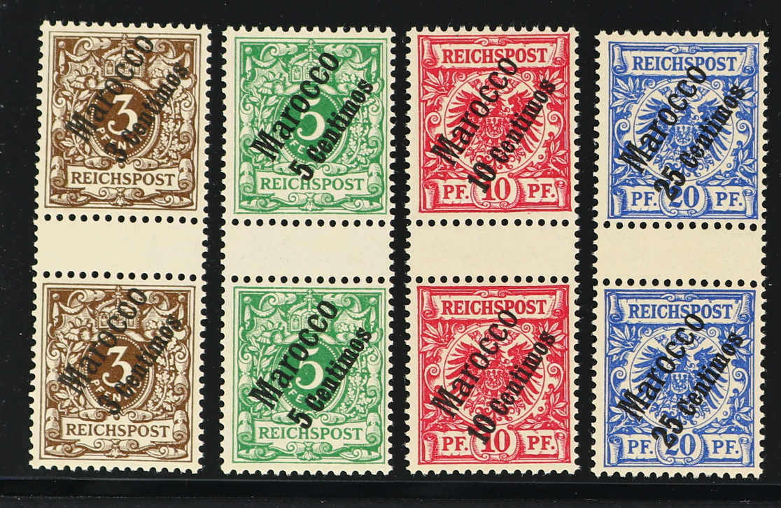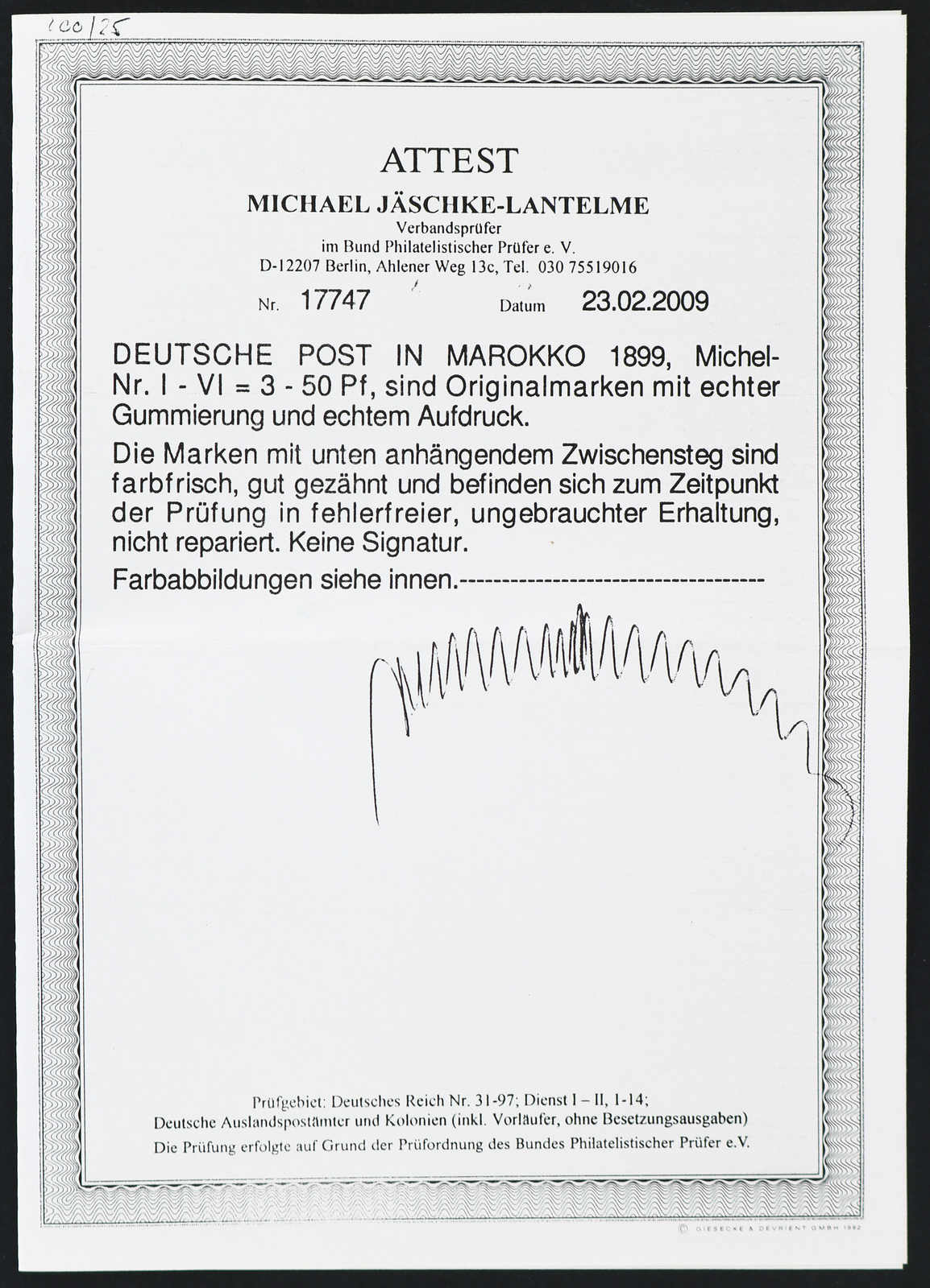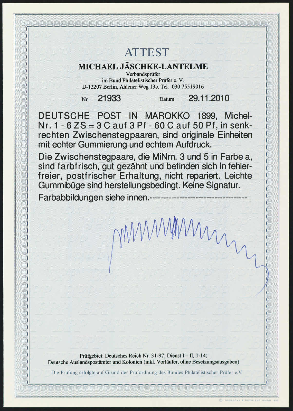1899, 3 C. auf 3 Pfg. bis 60 C. auf 50 Pfg. Aufdruckausgabe, der komplette Satz in senkrechten Zwischenstegpaaren, postfrisch, einwandfrei, leichte Gummibüge sind herstellungsbedingt, unsigniert, Fotoattest Jäschke-Lantelme BPP (ME
