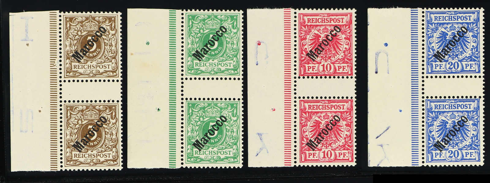 1899, 3-50 Pfg. diagonaler Aufdruck, der komplette Satz in senkrechten Zwischenstegpaaren vom linken Bogenrand, postfrisch, kleiner Einriss im Bogenrand der 3 Pfg., ansonsten einwandfreie Qualität, bei 3 und 5 Pfg. ist die Zähnung