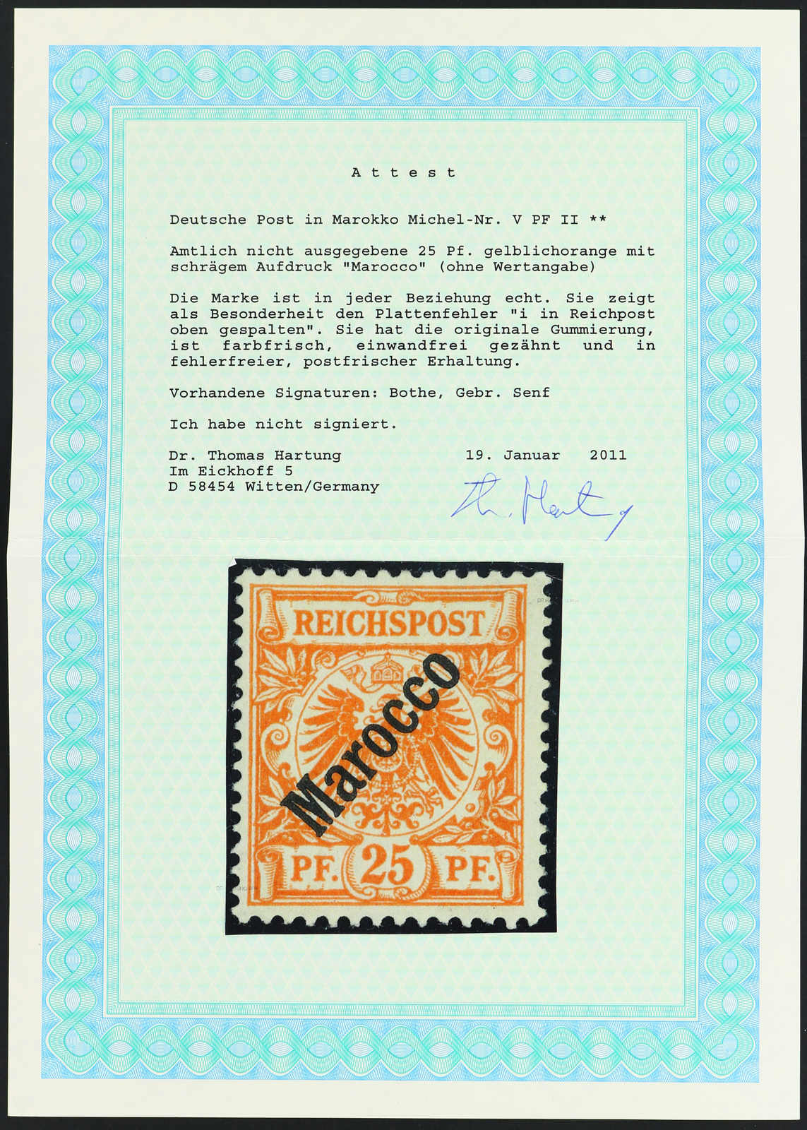 1899, 25 Pfg. diagonaler Aufdruck gelblichorange mit Plattenfehler "I in REICHSPOST oben gespalten", postfrisch, einwandfrei, signiert u.a. Bothe, Fotoexpertise Dr. Hartung (im Michel nicht notiert) (Image) (imagea)