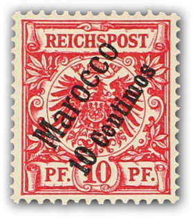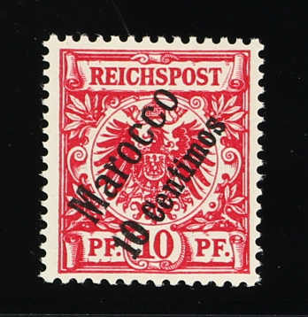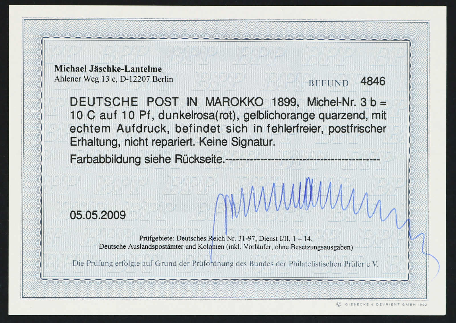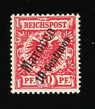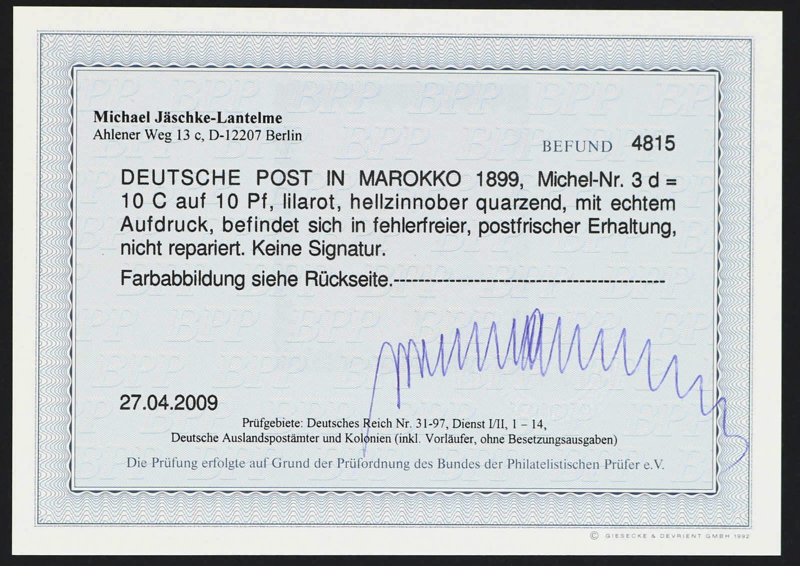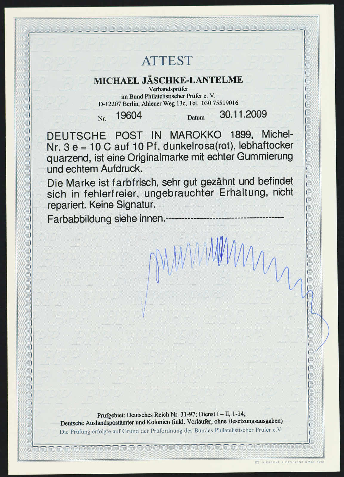 1899, 10 C. auf 10 Pfg. Aufdruckausgabe dunkelrosa(rot), lebhaftocker quarzend, ungebraucht, farbfrisch, einwandfrei, Fotoattest Jäschke-Lantelme BPP (ME 750,-) (Image) (imagea)