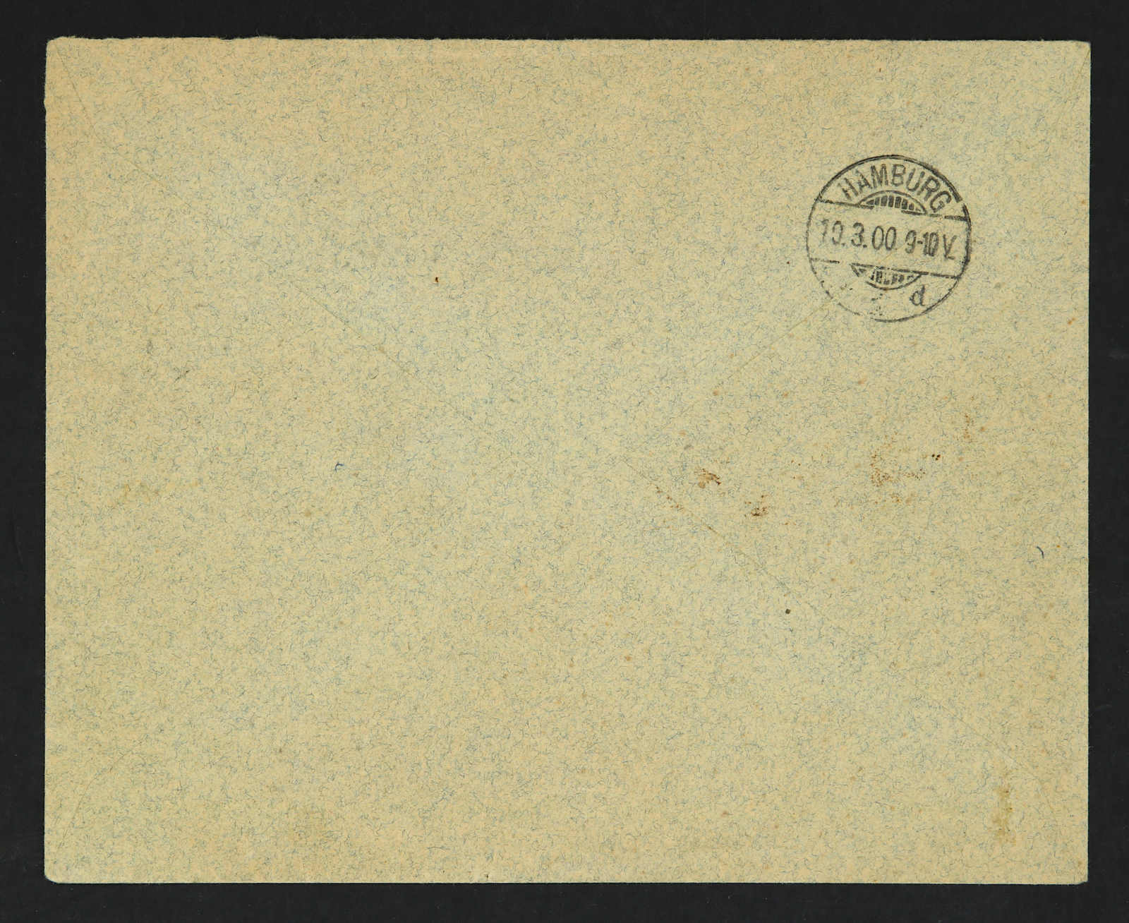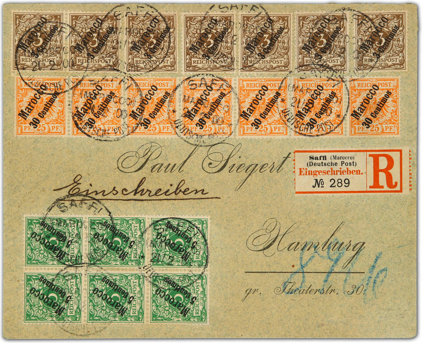 1900, 3 C. auf 3 Pfg. 7 Werte, 5 C. auf 5 Pfg. im 6er Block und 30 C. auf 25 Pfg. im waagerechten 7er-Streifen auf dekorativem Einschreibbrief, aufgegeben "SAFFI MAROCCO DEUTSCHE POST 21/2 00", adressiert nach Hamburg, rücks. Ankunftsstp.