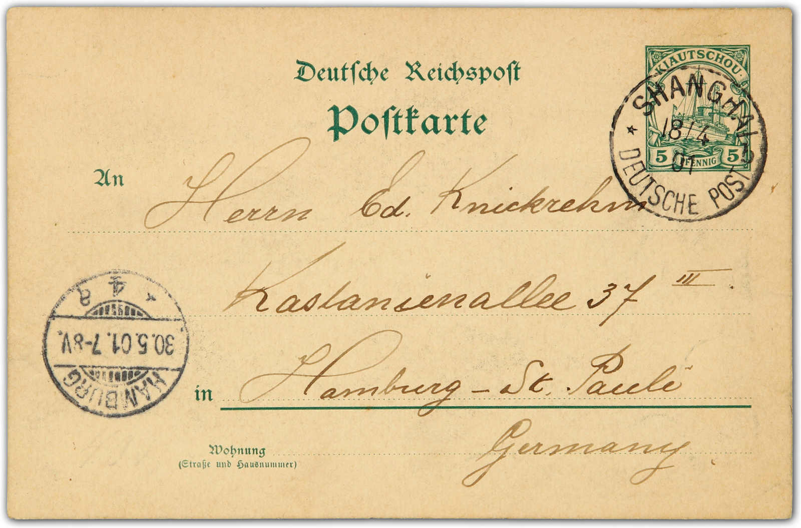 1901, 5 Pfg. Ganzsachen-Postkarte von Kiautschou als seltene Frühverwendung im Petschili-Gebiet, aufgegeben "SHANGHAI DEUTSCHE POST 18/4 01", adressiert nach Hamburg, mit vorders. Ankunftsstp. vom 30.5.01, rückseitig viel Bedarfstext,