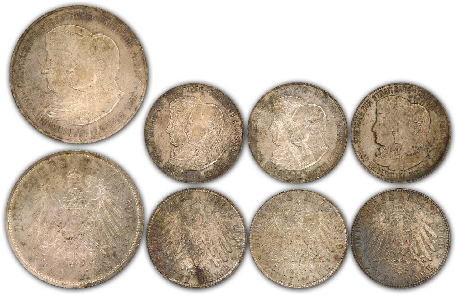 SACHSEN: 1909, Uni Leipzig, Lot 4 Stück, 3 mal 2 Mark und 1 Stück 5 Mark, alle vz mit unregelmäßiger Patina (Image)