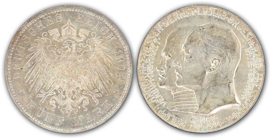 HESSEN: 1904, 5 Mark Landgraf Philipp / Großherzog Ernst Ludwig von Hessen, vz (Image)