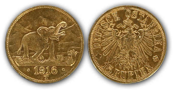 GOLD: 1916 T, Deutsch Ostafrika, 15 Rupien, 7g 750/1000 Gold (Image)