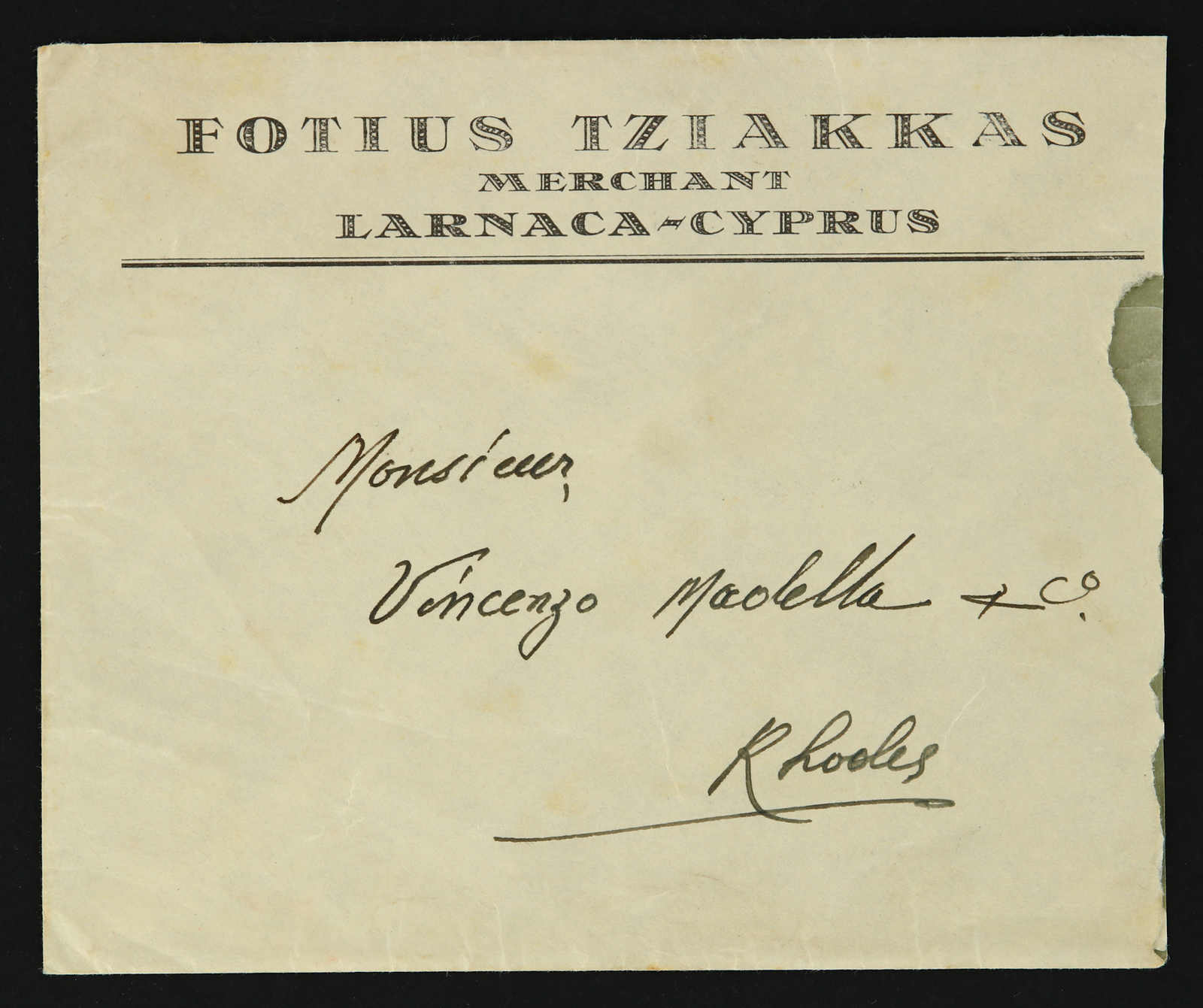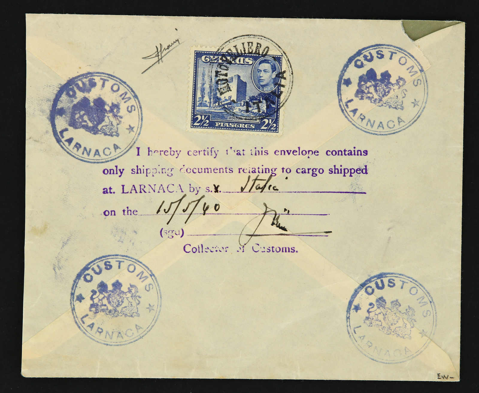1940, cover sent from Larnaca to Rhodes island bearing on reverse 2½ piastres tied by "motoveliero/Italia'" and "Customs / Larnaca" cachets