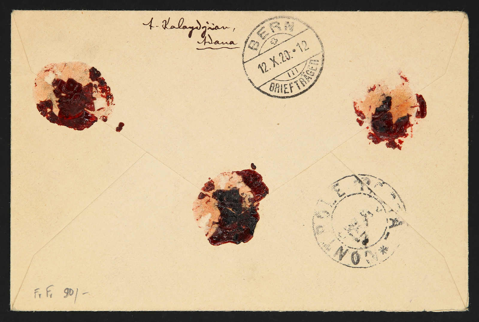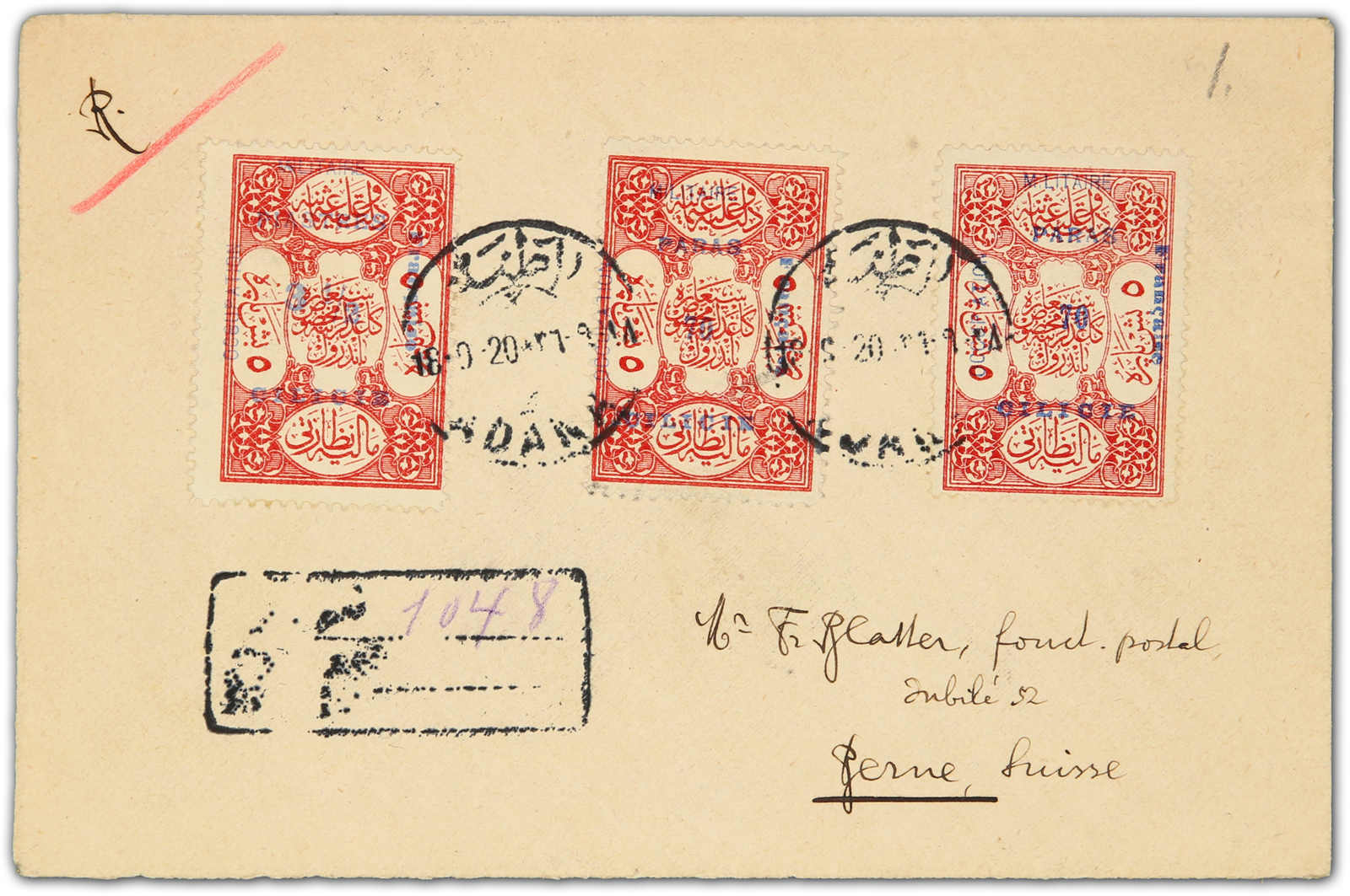 1920, registered cover bearing 2x 70 paras and 3½ piastres tied by bilingual "ADANA 2" postmarks sent to Bern/Switzerland, alongside Ottoman "R 1049" registration cachet, on reverse censor mark and arrival cds (Image) (imagea)