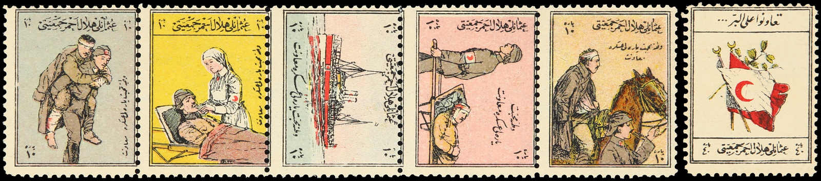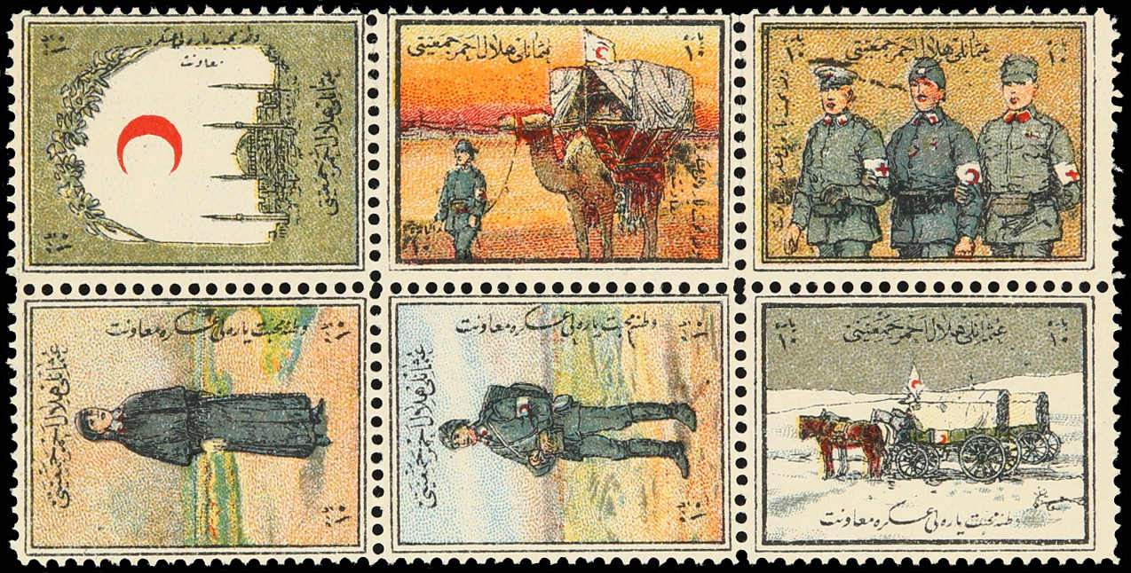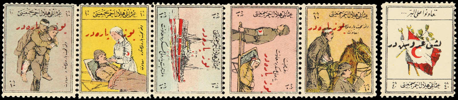 1912, unmounted mint Ottoman League of the Red Crescent charity set of 6 stamps 5 stamps as stripe (Image)