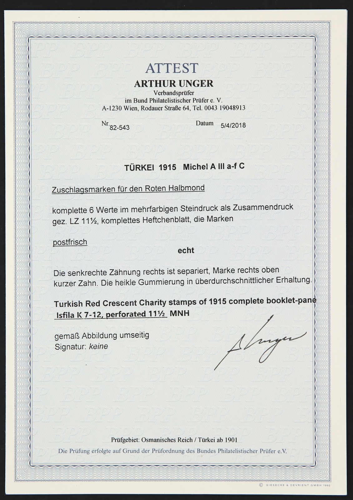 1915, Ottoman League of the Red Crescent charity set unmounted mint with orijinal gum as pane of 6, one value shortened perf tip, certificate A.Unger