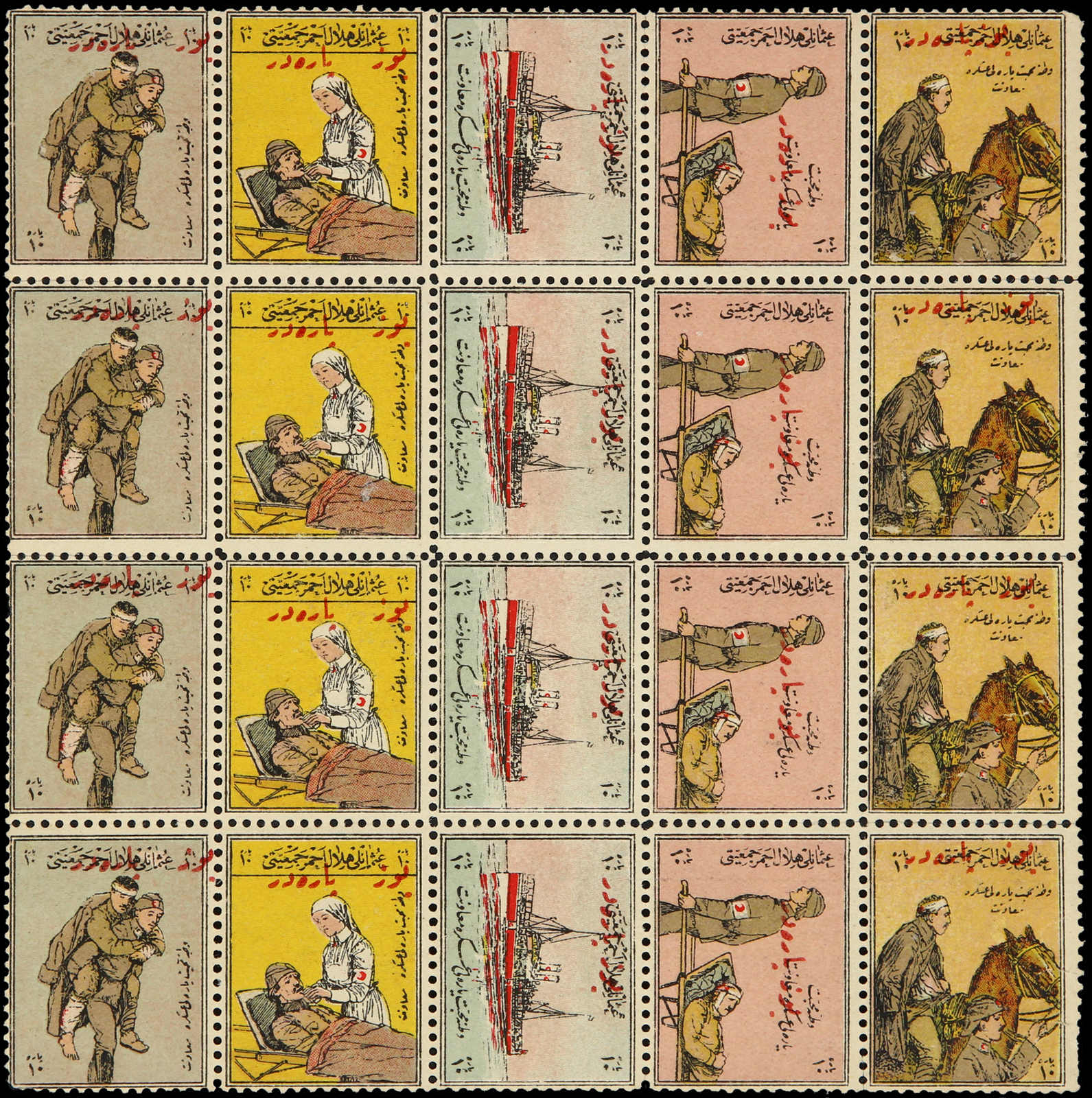 1916, unmounted mint surcharged Ottoman League of the Red Crescent charity set of 6 stamps 5 stamps as stripe (Image)