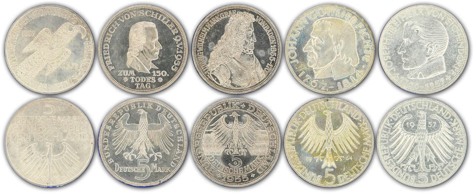 DIE ERSTEN FÜNF: 1952/64, die berühmten "Ersten Fünf" 5 Sonder DM, Germanisches Museum bis Fichte in vz (Image)
