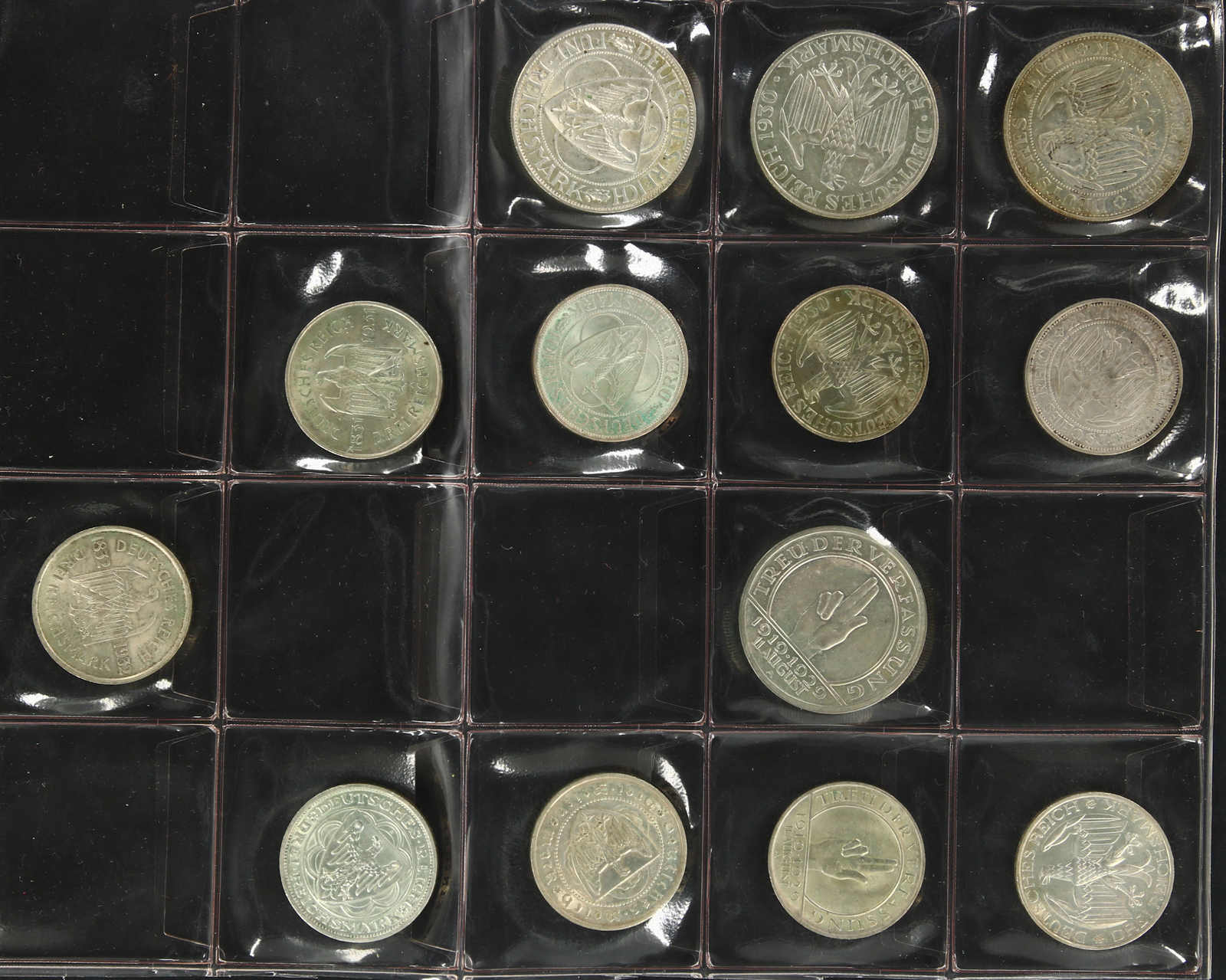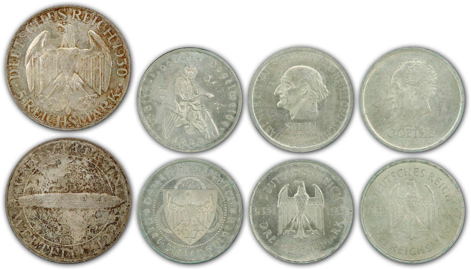 Dinkelsbühl 1928, 1928 Dürer stgl, 1929 Lessing vz, 1929 Waldeck stgl, 1929 Verfassung stgl, 1929 Meissen vz, 1930 Zeppelin stgl, 1930 Rhein stgl, 1930 Vogelweide vz, 1931 Magdeburg stgl, 1931 Stein vz - weiter mit 5 RM: 1925 A Tausendjahrfeier stgl,
