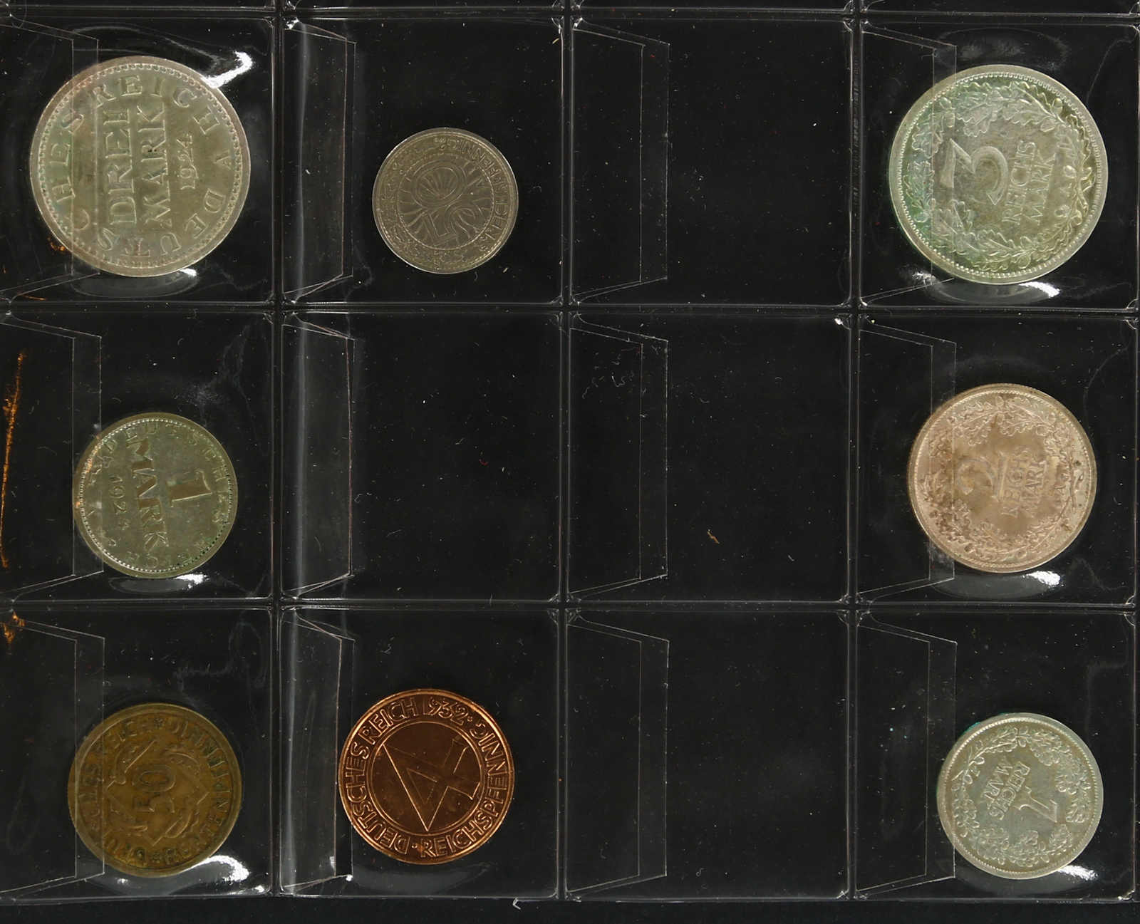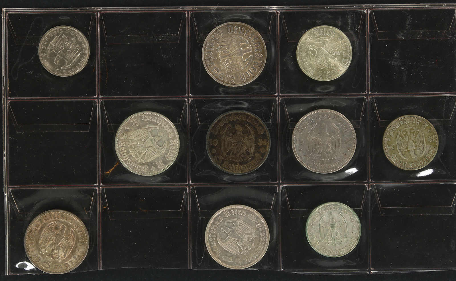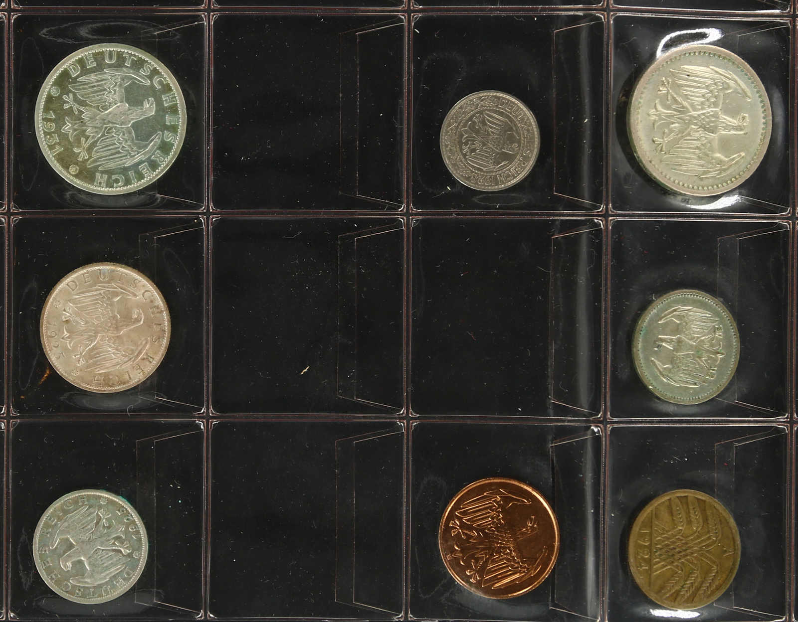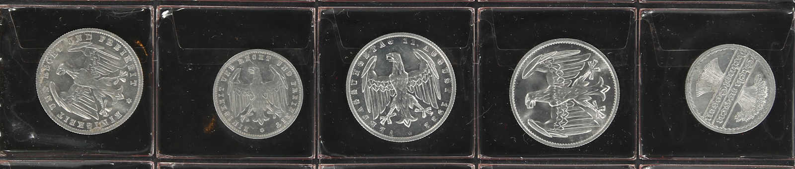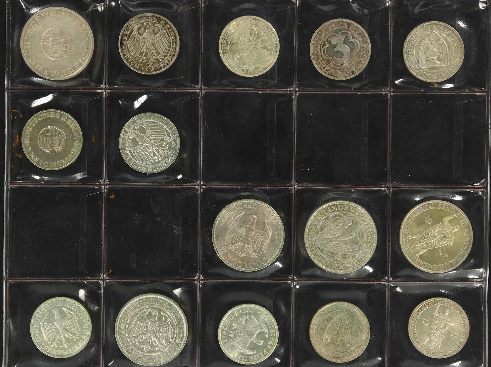 WEIMAR: 19201930 ca., schöner wertiger Silberposten, Silberumlaufmünzen vz und weiter 3 RM: 1925 Rheinlande stgl, 1926 Lübeck vz, 1927 Bremerhaven stgl, 1927 Tübingen stgl1927 Nordhausen vz, Marburg vz+, 1928 Naumburg ss+, 1928